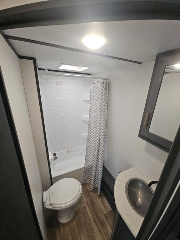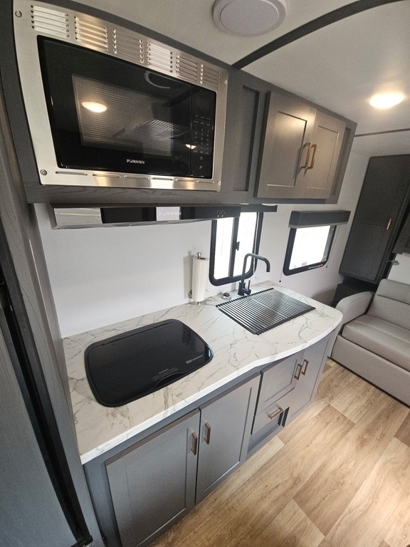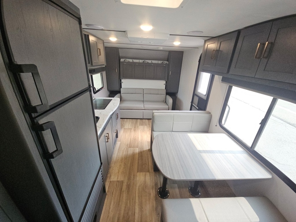 This Keystone has an overall length of 25.33 feet and comes equipped with a 15-foot power retractable awning with LED lighting, 1 A/C unit, solar, bunk beds, an outdoor kitchen, and room to sleep up to 7. This unit has been well-maintained.