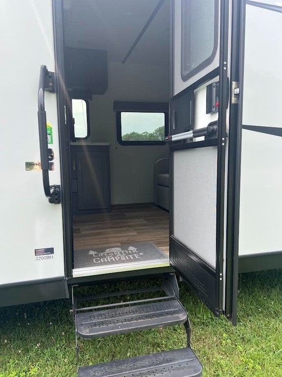 “2022 Keystone Bullet Crossfire 2200BH Travel Trailer – like new and only used three times. This lightweight, family-friendly trailer has been stored under cover since purchase and is in excellent condition. It features keyless entry for convenience, solar power for off-grid capability, and LED lighting on the awning for evening ambiance. Entertainment-ready with an outdoor kitchen, speakers, and TV hookup, it’s perfect for camping with family or friends. A sway bar and hitch are included in the sale, making towing safer and easier. Power leveling jacks and Well-maintained, clean, and ready for the next adventure.”