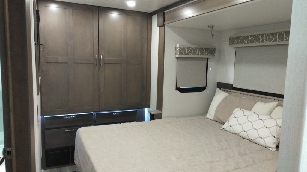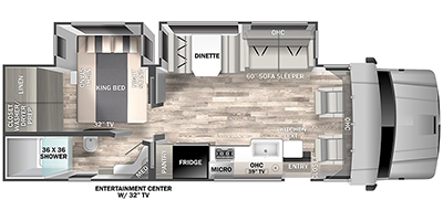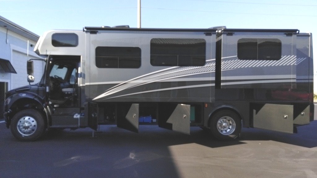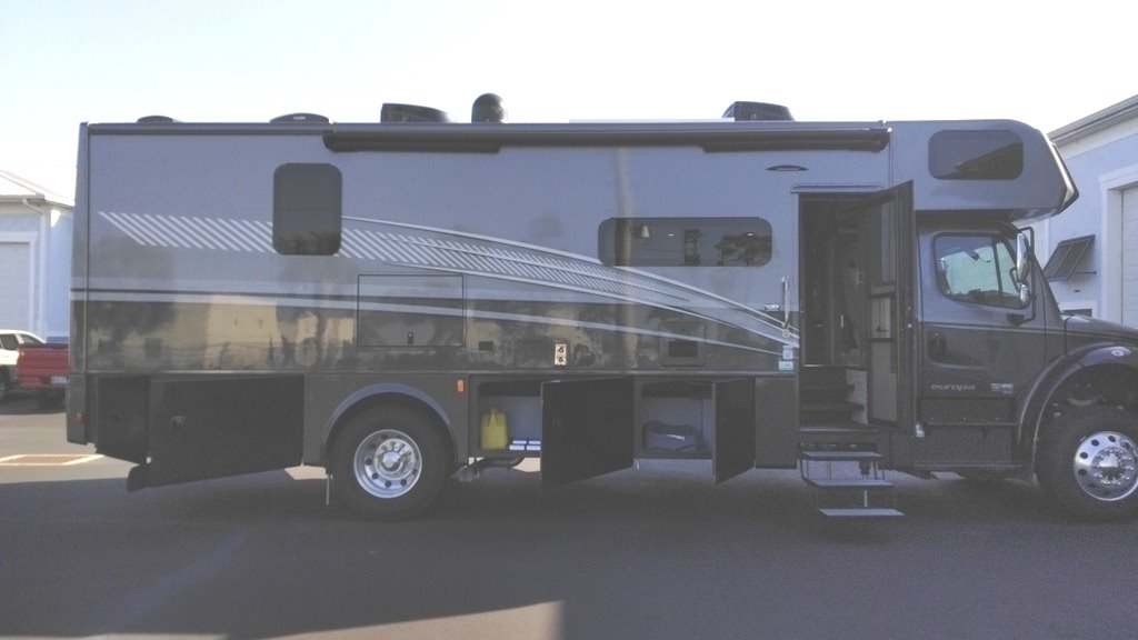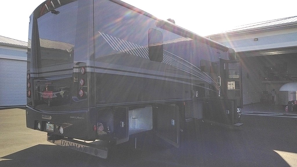 This Dynamax is powered by a 6.7L I6 diesel engine and a 6-speed automatic transmission with 5,000 miles. The overall length is 33.42 feet and it comes equipped with 2 power retractable slide-outs, 1 power retractable awning, 2 A/C units, a generator, outdoor entertainment, and room to sleep 8. This unit has been well-maintained.
