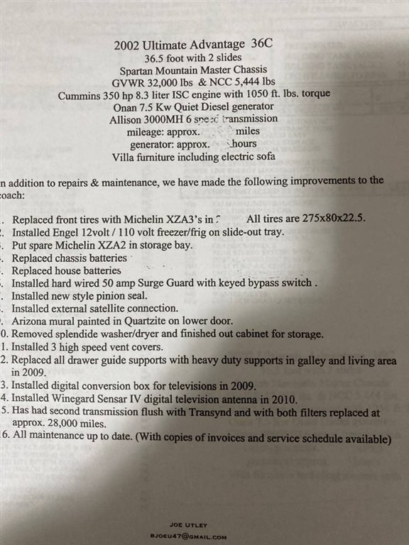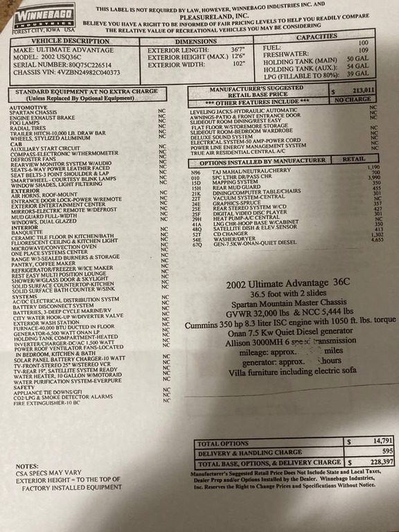 This 2002 Winnebago is Approximately 36.6’ In Length With 114,348 Miles on a Spartan Ultibay Chassis. This RV Has a Cummins ISC 350 HP Turbo Diesel Engine and an Automatic Transmission. It features Two Slide Out, 1 Awning, and a 7.5Kw Onan Diesel Generator. This unit sleeps Four people. This Coach sit on a Spartan Mountain Chassis.