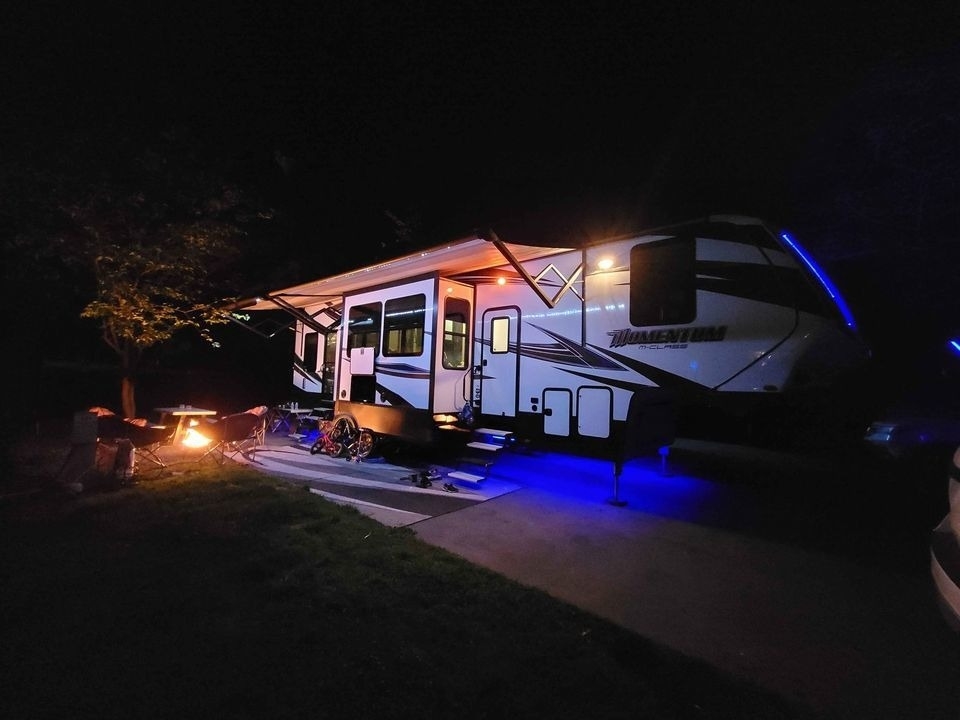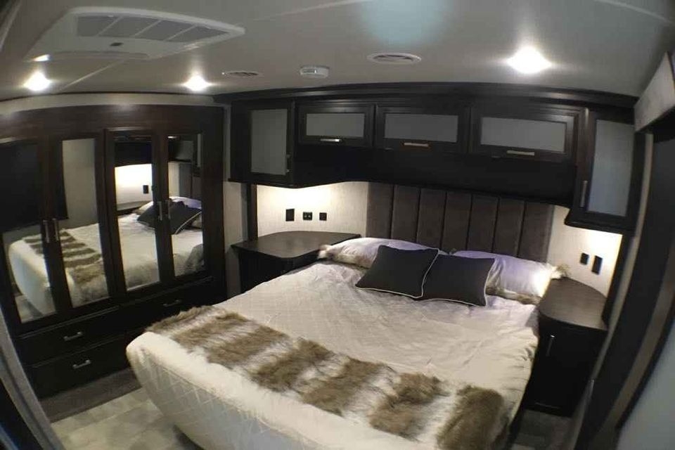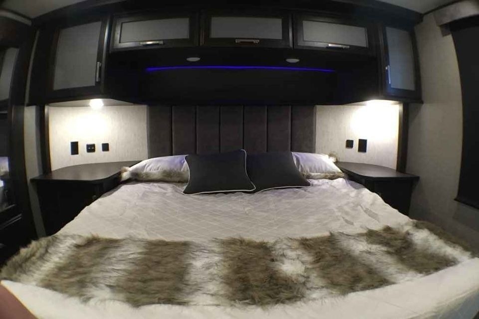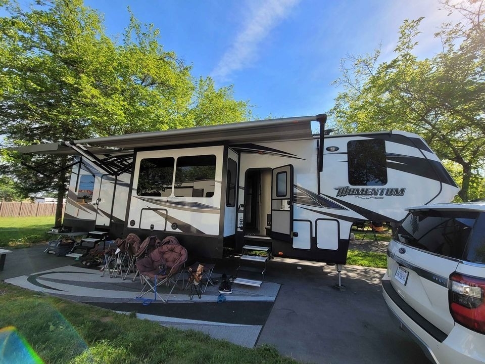 This 2017 Grand Design Momentum M-Class 349M has an overall length of 38 feet and comes equipped with a 5,500 Cummins Generator, 3 Slide Outs, 2 Awnings, 3 A/C units and plenty of room to sleep 6-8.