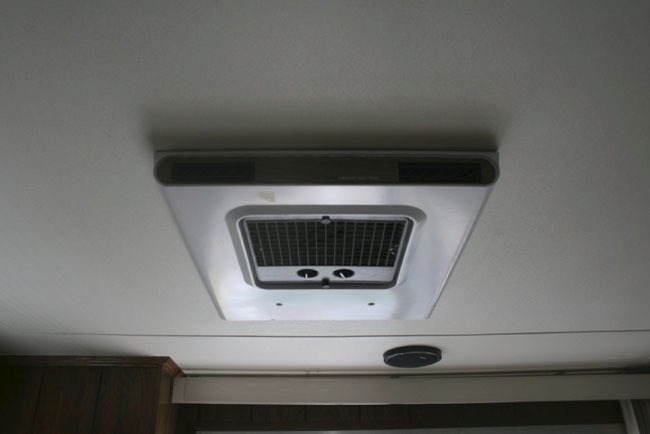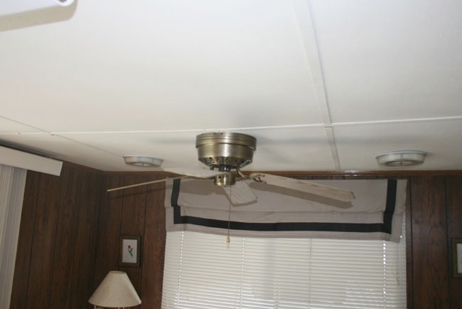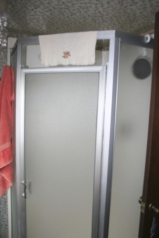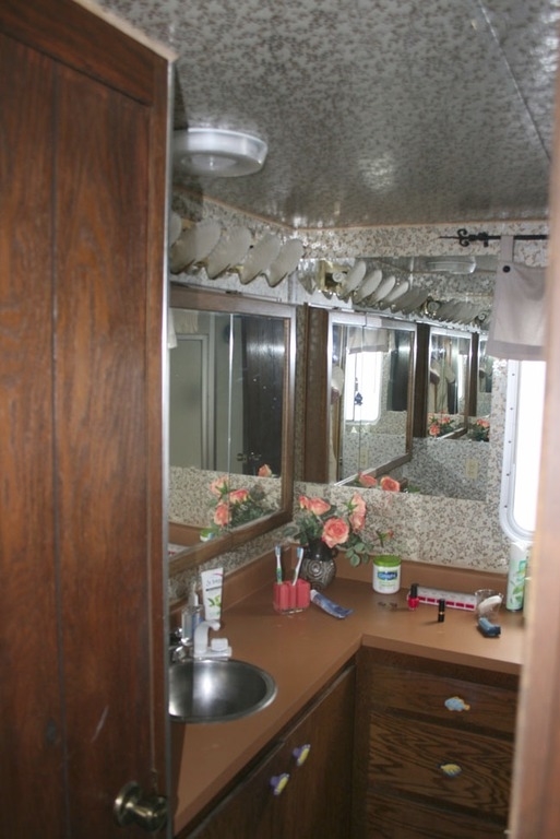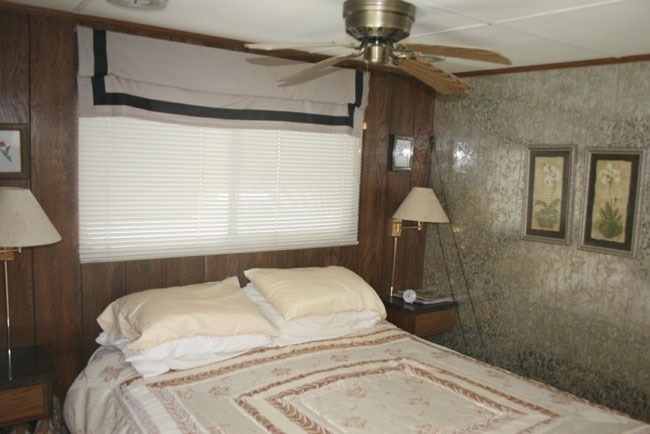 There is beautiful and practical foil wallpaper in the full size bathroom and master bedroom with a ceiling fan above the bed.