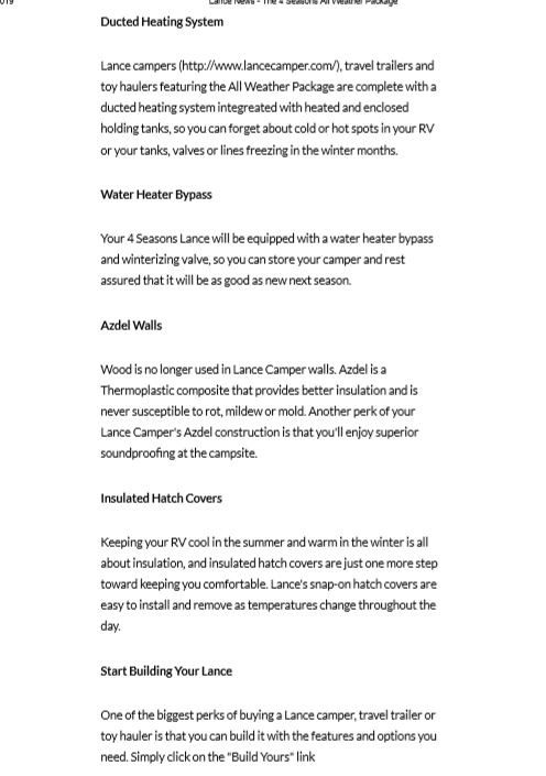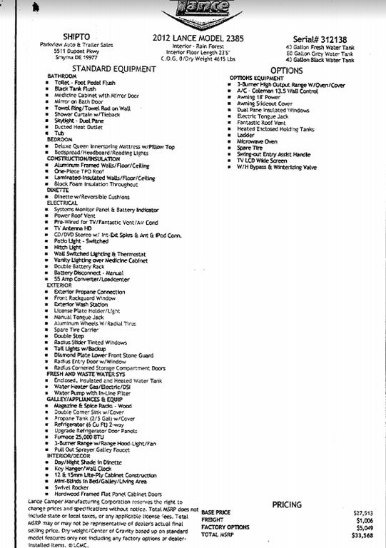 This 2012 Lance 2385 has an overall length is 28 feet and comes equipped a with 1 awning, 1 slide out and sleeps 4. This is a non-pet/non-smoking Travel Trailer and there has not been any accidents or water damage.