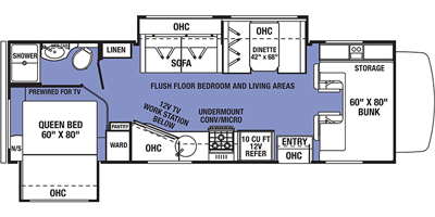 Queen bed in the rear, overhead bunk, convertible dinette, and sofa bed.