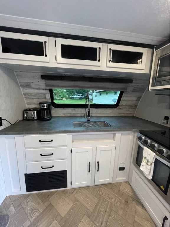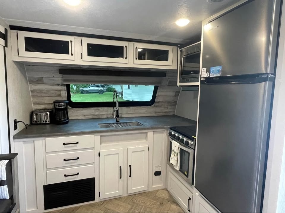 Full Front Kitchen With 3-Burner Stove, Microwave, And Full-Size Fridge