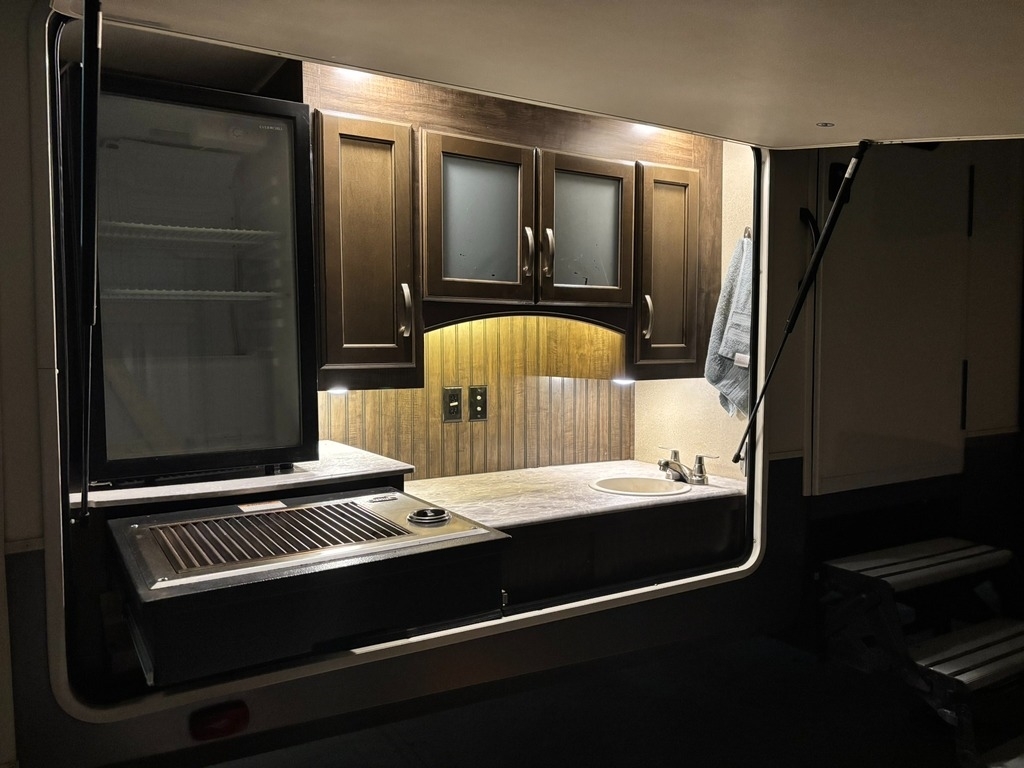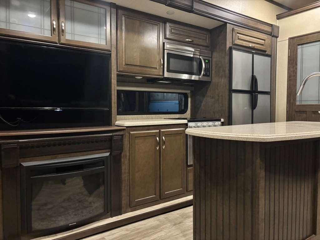 This Grand Design has an overall length of 40.33 feet and comes equipped with 4 power-retractable slide-outs, 2 power awnings, 2 A/C units, 1½ baths, a bunkhouse, a fireplace, an outdoor kitchen, and plenty of room to sleep 10. This unit has been well-maintained.