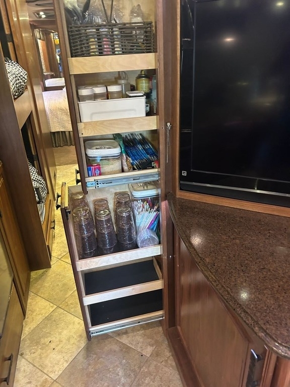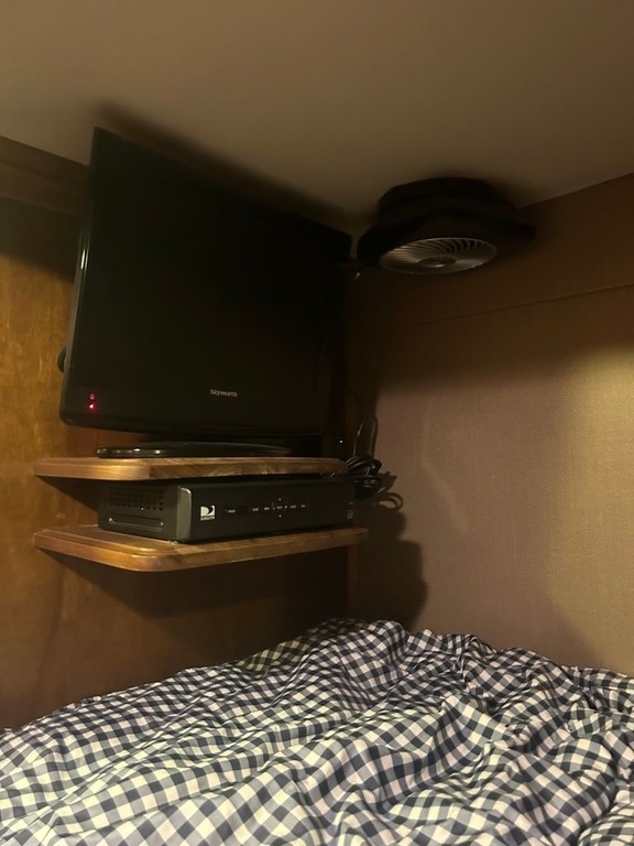king bed, clothing storage, a TV, and overhead storage for added convenience.