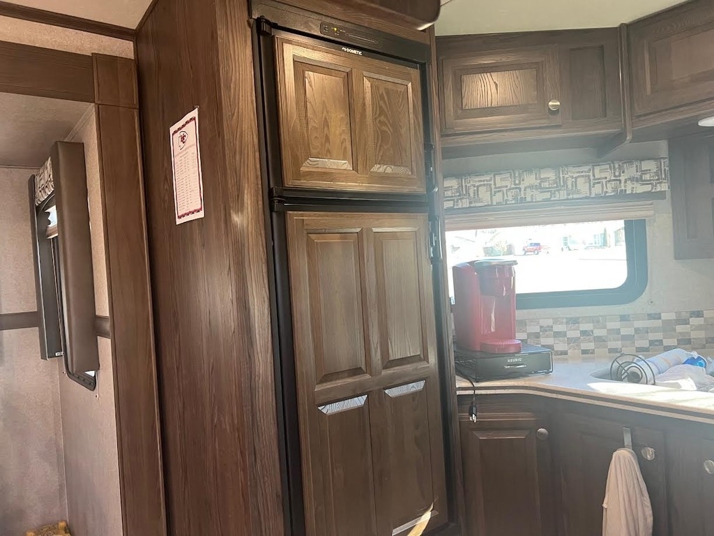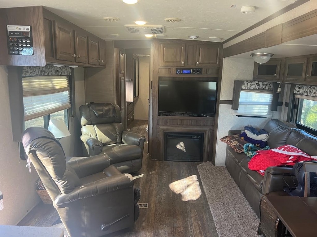 This Forest River has an overall length of 34.58 feet and comes equipped with 2 power-retractable slide-outs, a 21-foot power awning, 2 A/C units, a fireplace, and room to sleep up to 6. This unit has been well-maintained.
