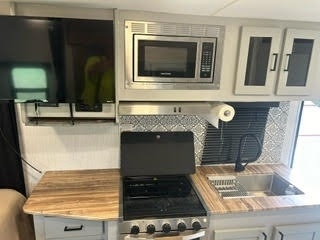 Full Kitchen With 3-Burner Stove, Oven, Microwave, And Full-Size Fridge
