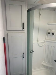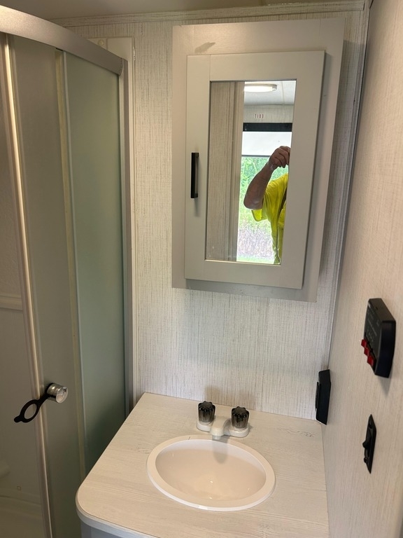 Center Bath With Plastic/Glass Shower, Fan, And Medicine Cabinet