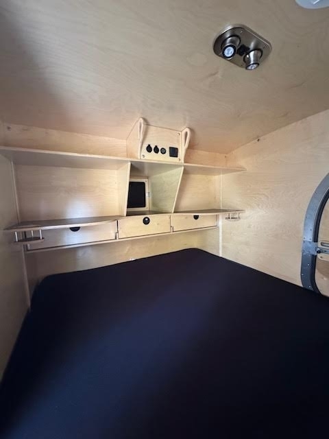 Insulated cabin with built in cabinetry and built in reading lights