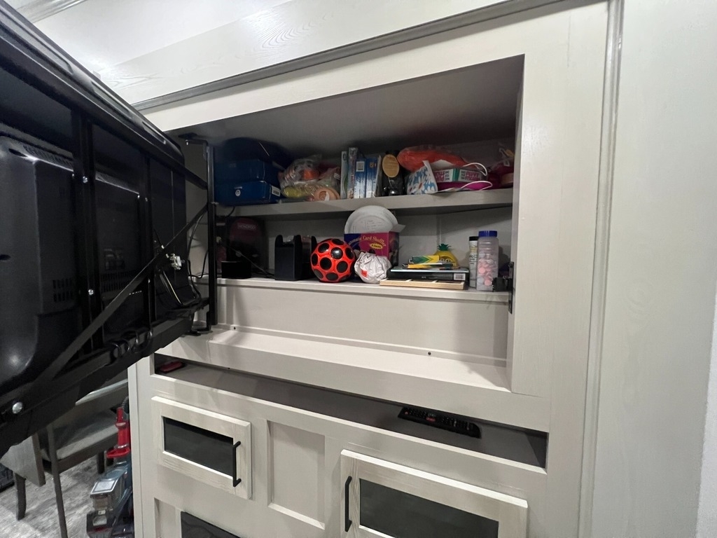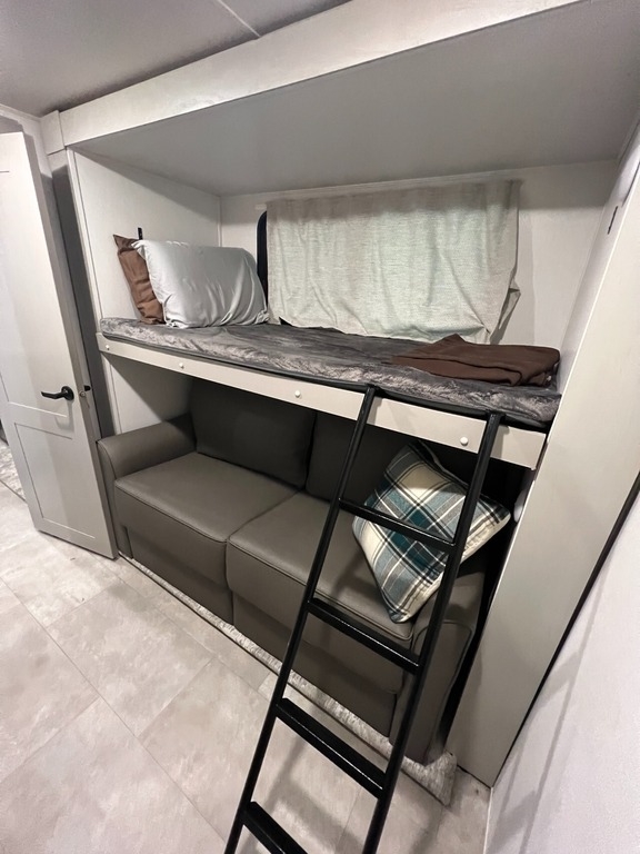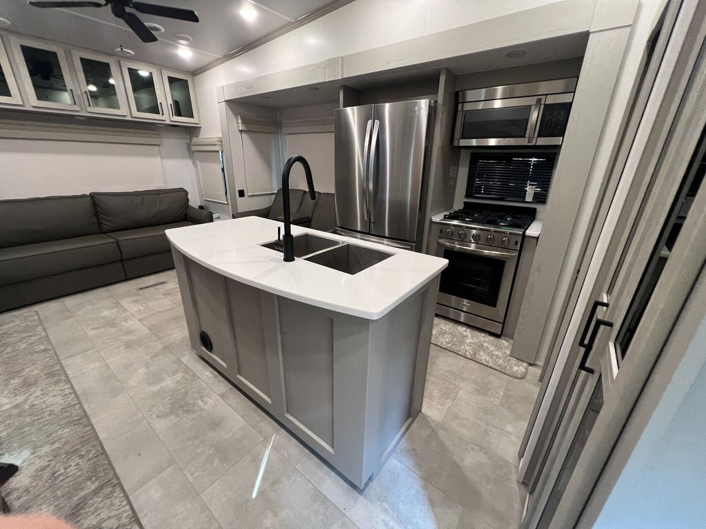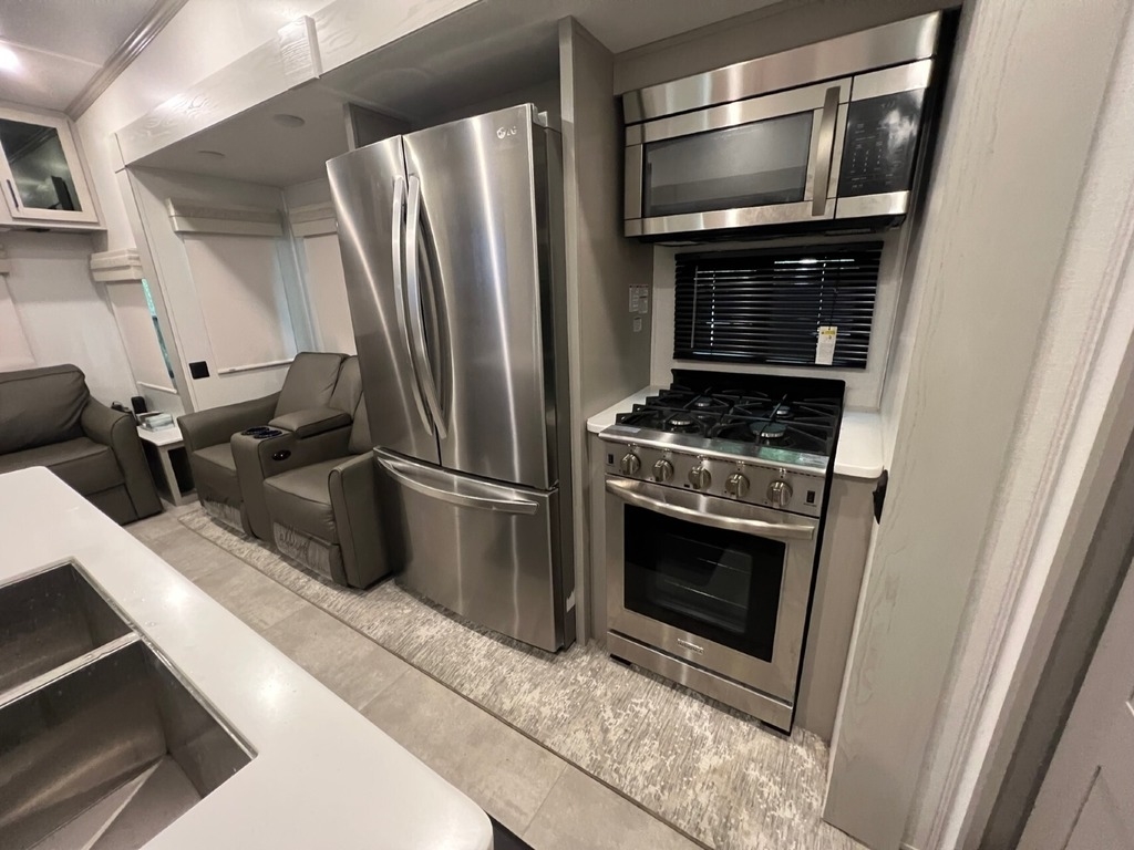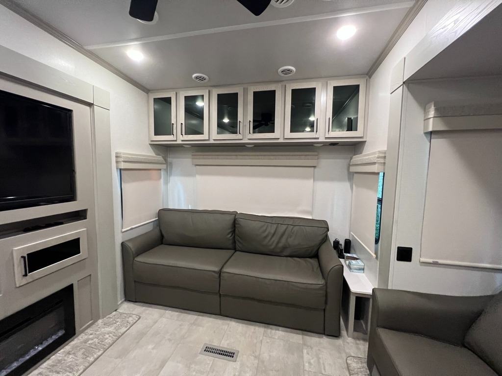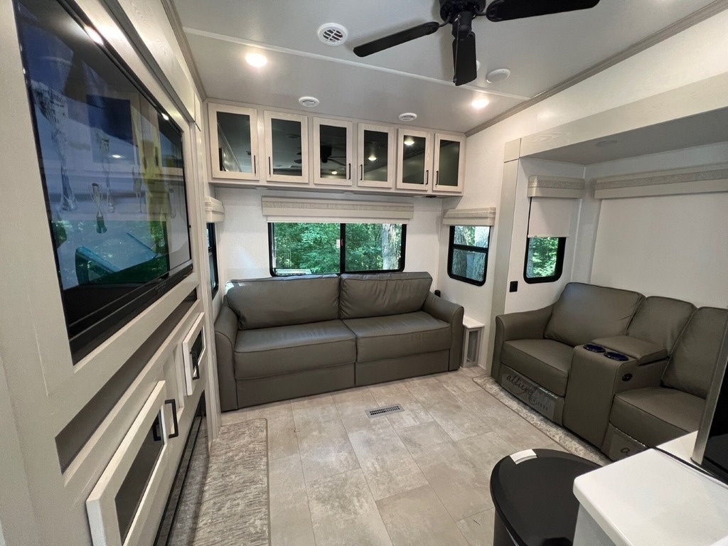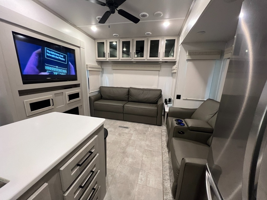 “We’ve thoroughly enjoyed our time camping, but now it’s time to move on to the next chapter and focus on our home and family. This camper has been the perfect companion, offering unparalleled comfort no matter the weather. It’s equipped with two air conditioners for hot days, a furnace, an electric fireplace, and an underbelly heater for chilly nights, ensuring the interior always stays comfortable. With four slide-outs—one in the main bedroom, mid bedroom, living room, and kitchen—there’s plenty of space to spread out. The front of the camper features a spacious main bedroom with a king bed, built-in dresser, a large closet, and a washer/dryer hookup. The bathroom includes a roomy stand-up shower with a seat, triple-slide glass doors, a remote-controlled exhaust fan, and a stainless-steel sink with storage underneath and behind the mirror. In the midsection, there’s a large loft queen bunk above a bunk room below, complete with a tri-fold couch/bed and a single bunk above. At the rear, the kitchen, dining, and living areas are bathed in light thanks to large windows that span the entire width of the back, making the space feel even larger. The kitchen boasts residential-sized appliances, including a fridge, microwave, and stove, as well as a kitchen island with a double-basin stainless steel sink. The living area is outfitted with two recliners and a full-size couch that converts into a king-sized pullout bed, plus ample overhead storage. There’s a massive built-in storage area behind the TV—perfect for family games, crafts, or extra kitchen items—and a dining table with four chairs completes the space. Outside, the camper features an outdoor kitchen with a built-in griddle, hand sink, and fridge—ideal for enjoying meals and drinks by the fire. To protect the camper, all slide-outs have toppers to prevent debris from affecting the seals, and the awnings are equipped with aluminum protectors for transport. The camper also features a hydraulic auto-level system, which makes setup a breeze—just unhook, pull out the truck, and hit the auto-level button, and the camper does the rest. Additional amenities include a water flow control station, built-in water filter housing, an inverter, and generator hookup. Delivery is available, pending location.”