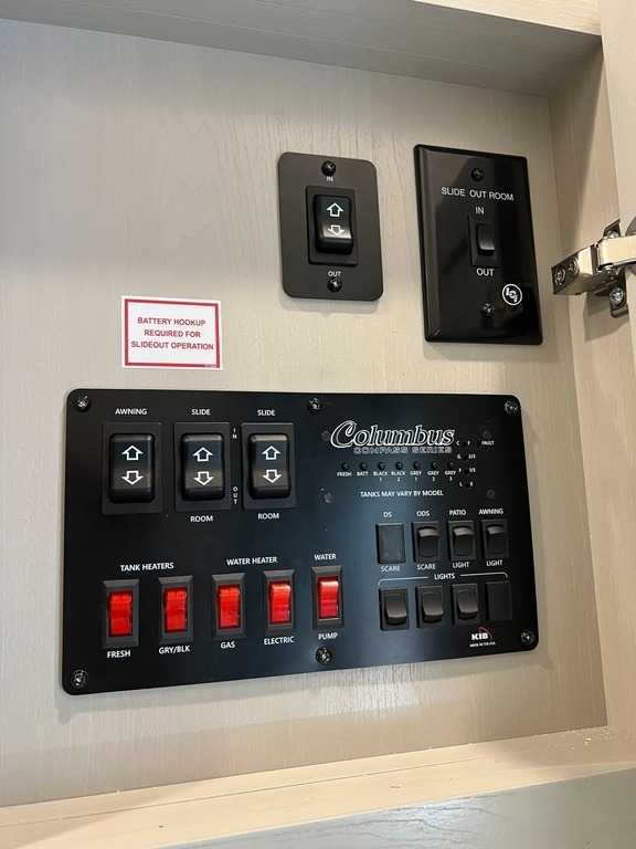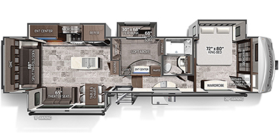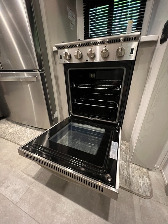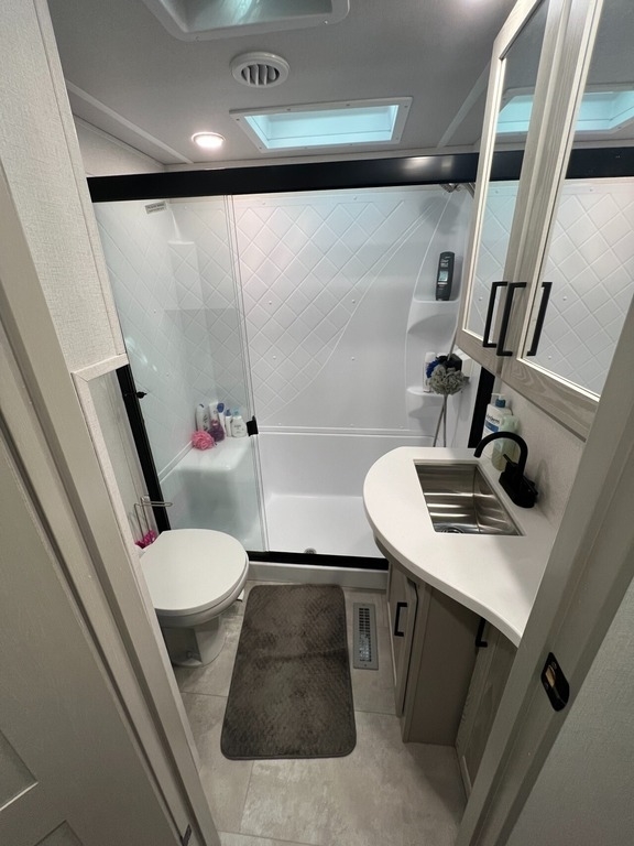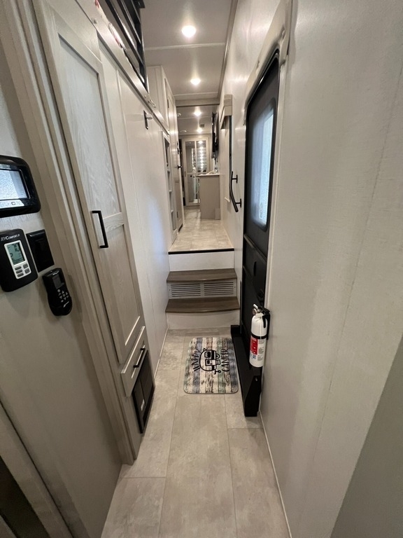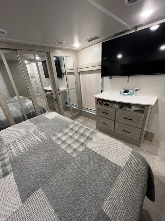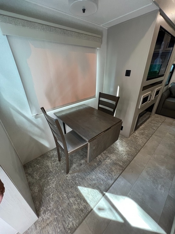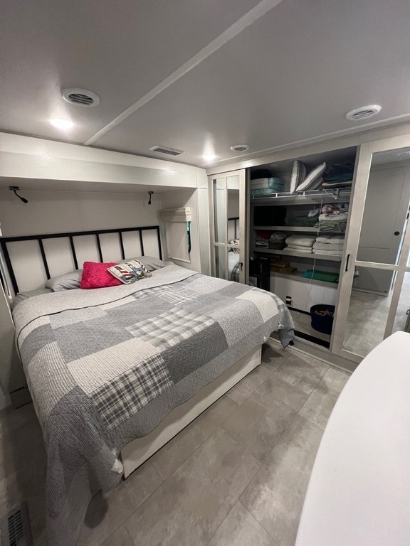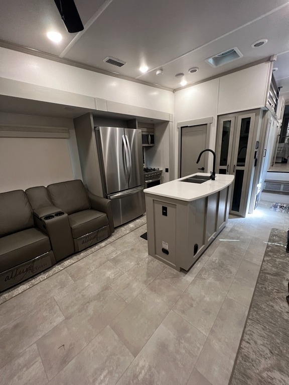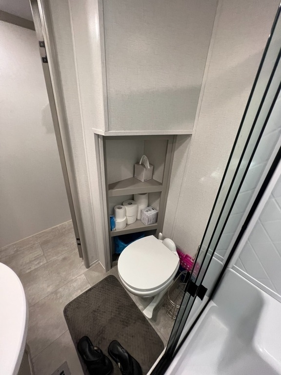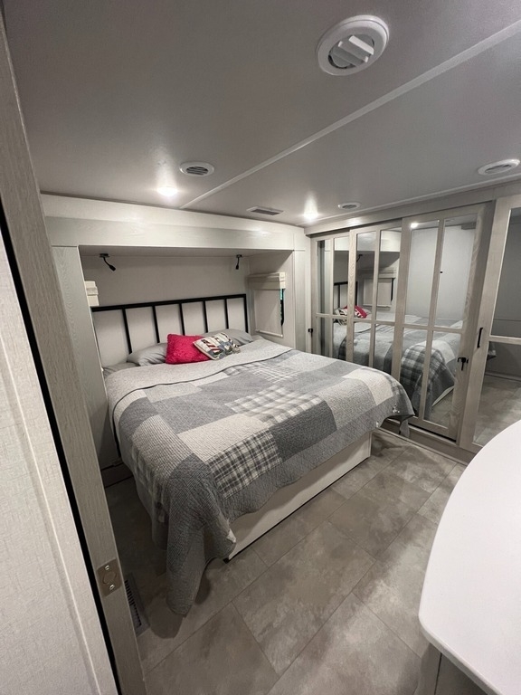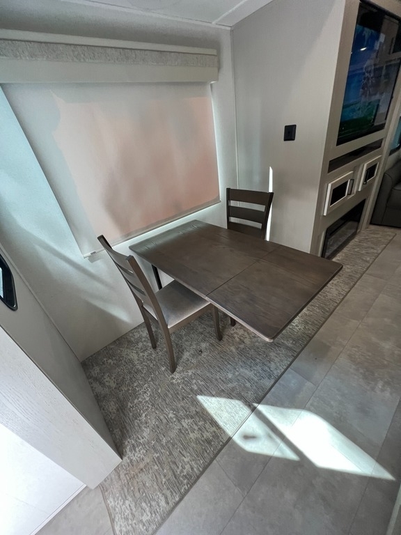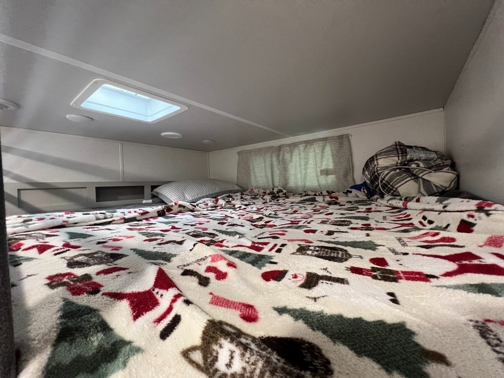 “We’ve thoroughly enjoyed our time camping, but now it’s time to move on to the next chapter and focus on our home and family. This camper has been the perfect companion, offering unparalleled comfort no matter the weather. It’s equipped with two air conditioners for hot days, a furnace, an electric fireplace, and an underbelly heater for chilly nights, ensuring the interior always stays comfortable. With four slide-outs—one in the main bedroom, mid bedroom, living room, and kitchen—there’s plenty of space to spread out. The front of the camper features a spacious main bedroom with a king bed, built-in dresser, a large closet, and a washer/dryer hookup. The bathroom includes a roomy stand-up shower with a seat, triple-slide glass doors, a remote-controlled exhaust fan, and a stainless-steel sink with storage underneath and behind the mirror. In the midsection, there’s a large loft queen bunk above a bunk room below, complete with a tri-fold couch/bed and a single bunk above. At the rear, the kitchen, dining, and living areas are bathed in light thanks to large windows that span the entire width of the back, making the space feel even larger. The kitchen boasts residential-sized appliances, including a fridge, microwave, and stove, as well as a kitchen island with a double-basin stainless steel sink. The living area is outfitted with two recliners and a full-size couch that converts into a king-sized pullout bed, plus ample overhead storage. There’s a massive built-in storage area behind the TV—perfect for family games, crafts, or extra kitchen items—and a dining table with four chairs completes the space. Outside, the camper features an outdoor kitchen with a built-in griddle, hand sink, and fridge—ideal for enjoying meals and drinks by the fire. To protect the camper, all slide-outs have toppers to prevent debris from affecting the seals, and the awnings are equipped with aluminum protectors for transport. The camper also features a hydraulic auto-level system, which makes setup a breeze—just unhook, pull out the truck, and hit the auto-level button, and the camper does the rest. Additional amenities include a water flow control station, built-in water filter housing, an inverter, and generator hookup. Delivery is available, pending location.”