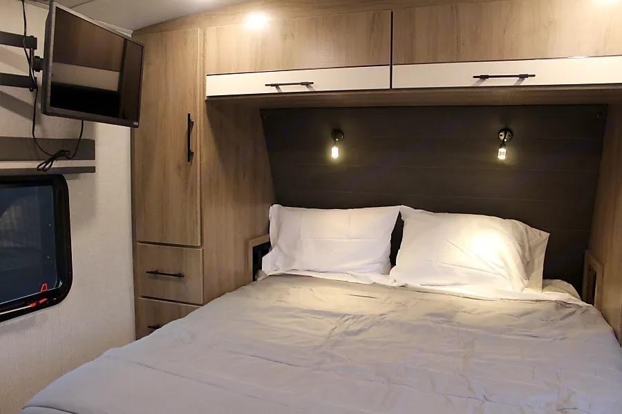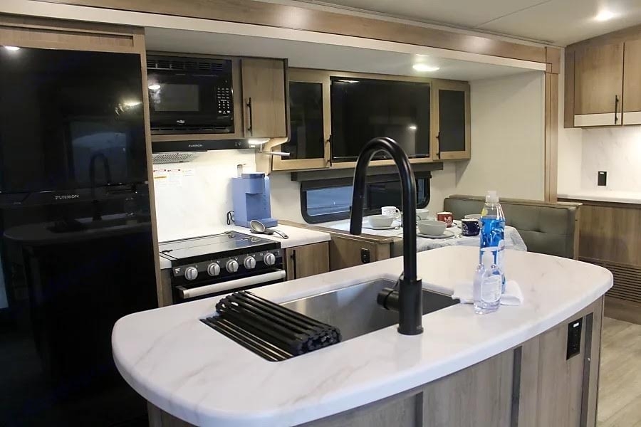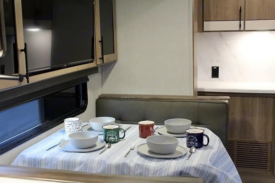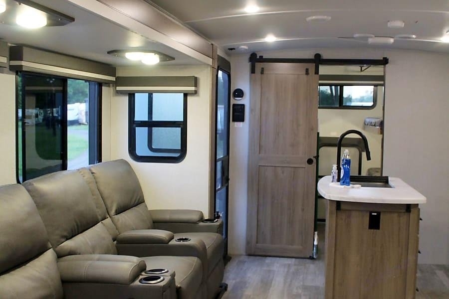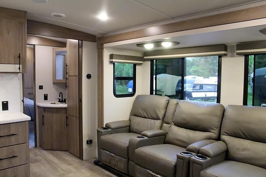 The trailer offers a comfortable and modern interior with a full