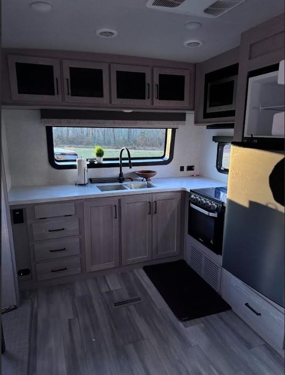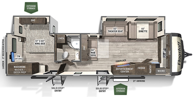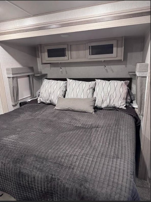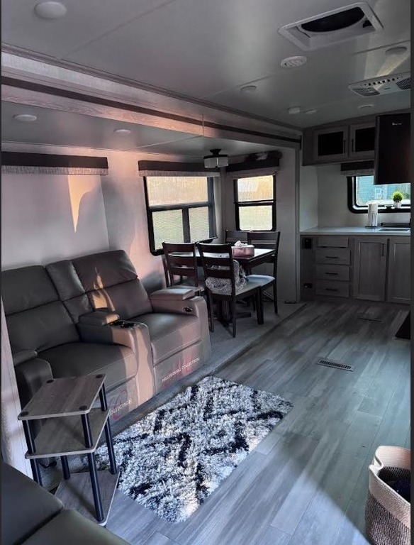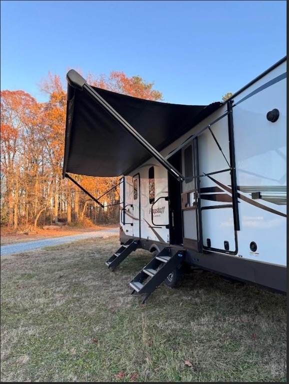 This Forest River has an overall length of 36.67 feet and comes equipped with 2 power retractable slide-outs, 1 power retractable awning, A/C, and plenty of room to sleep 6. This unit has been well-maintained, and garage kept when not in use.