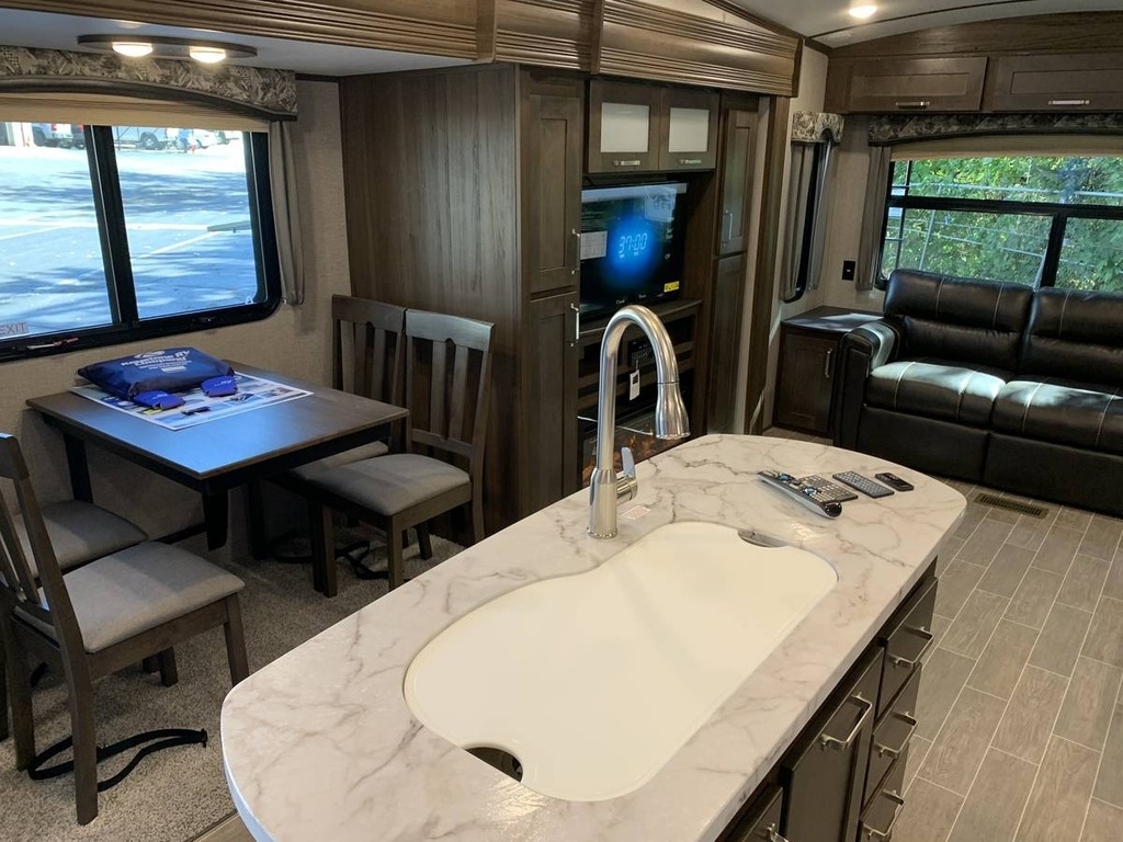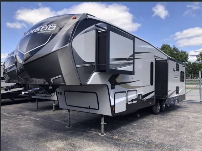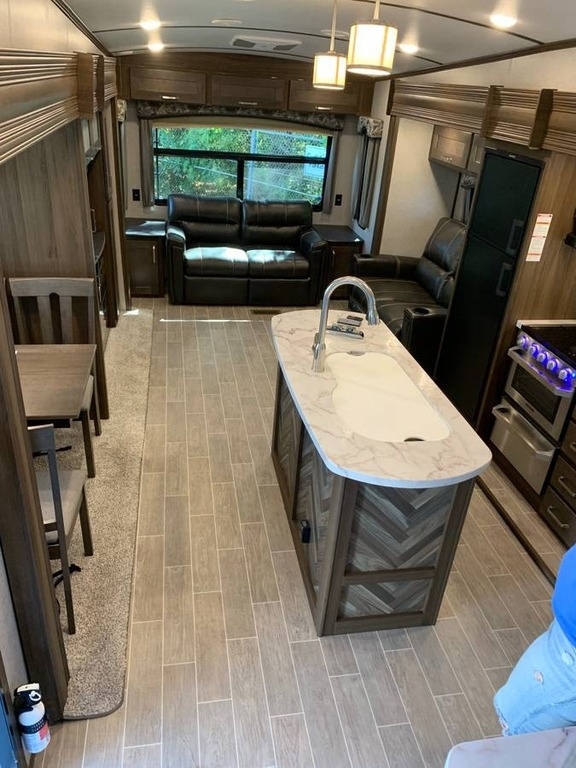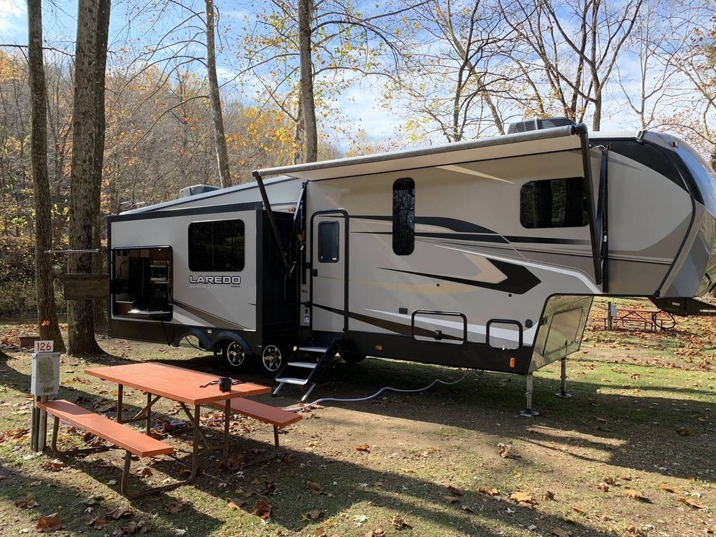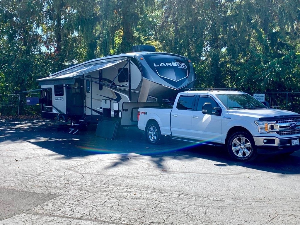 This 2019 Keystone Laredo Super Lite 298SRL Fifth Wheel is 34.5 feet long and comes equipped with three slide outs, a patio awning, two air conditioning units, and can sleep six people comfortably. I pull with my F-150 Eco Boost without issue.
