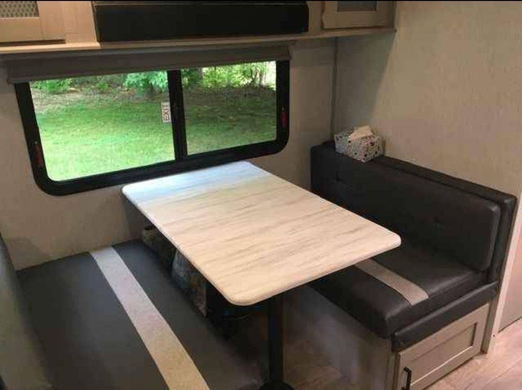 interior includes a walk-around RV queen bed, a booth dinette, and theater
