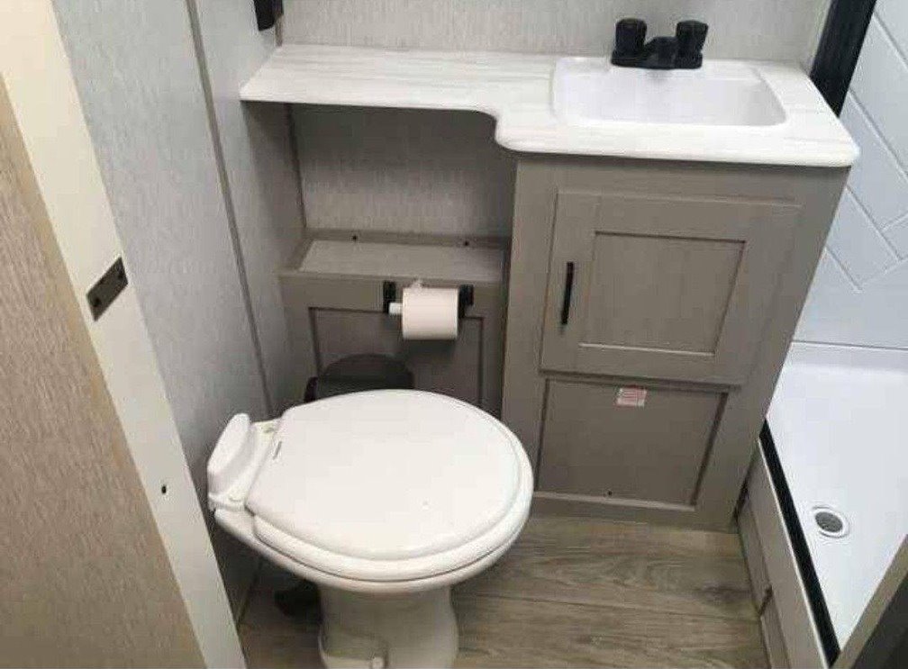 porcelain toilet, and a medicine cabinet. Additionally, the trailer comes with