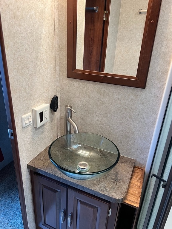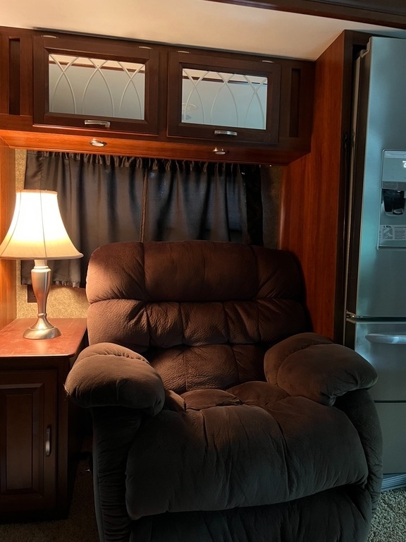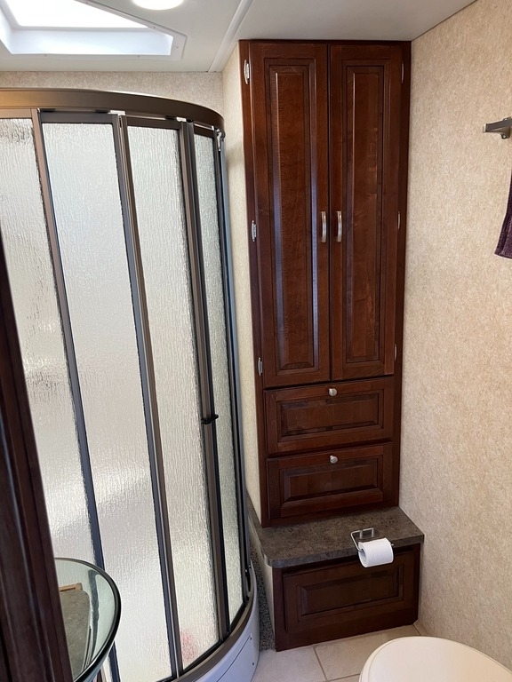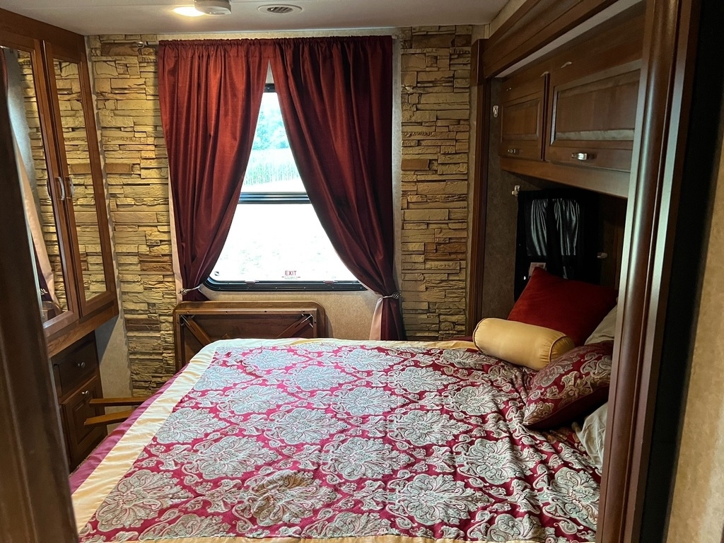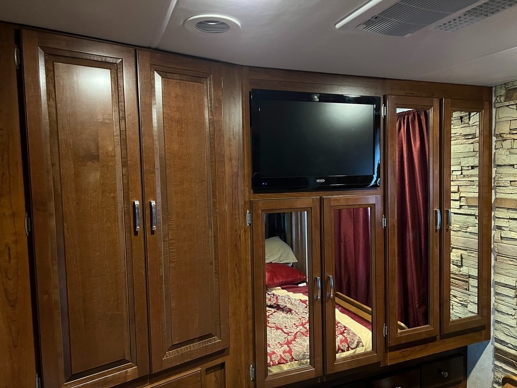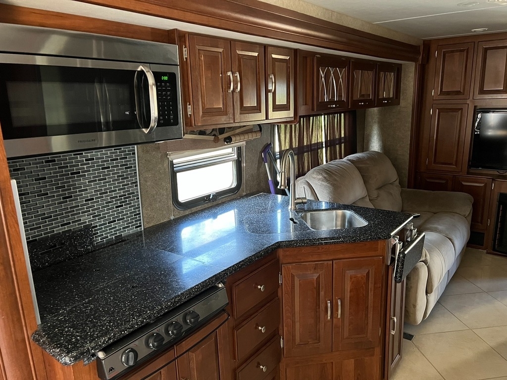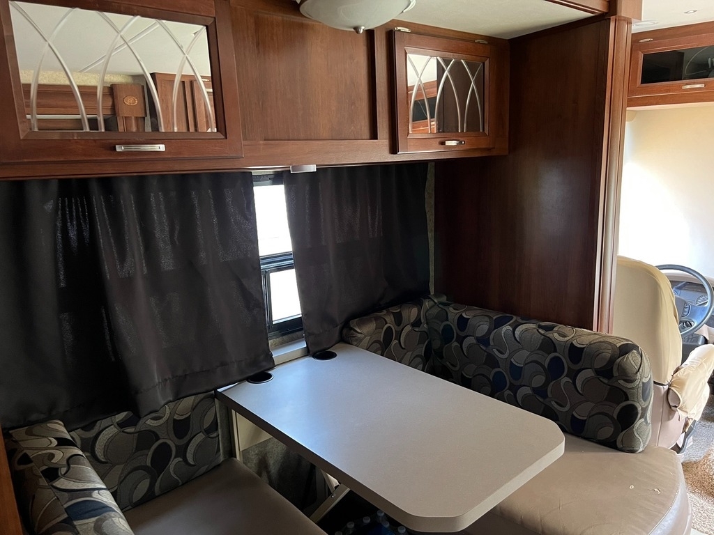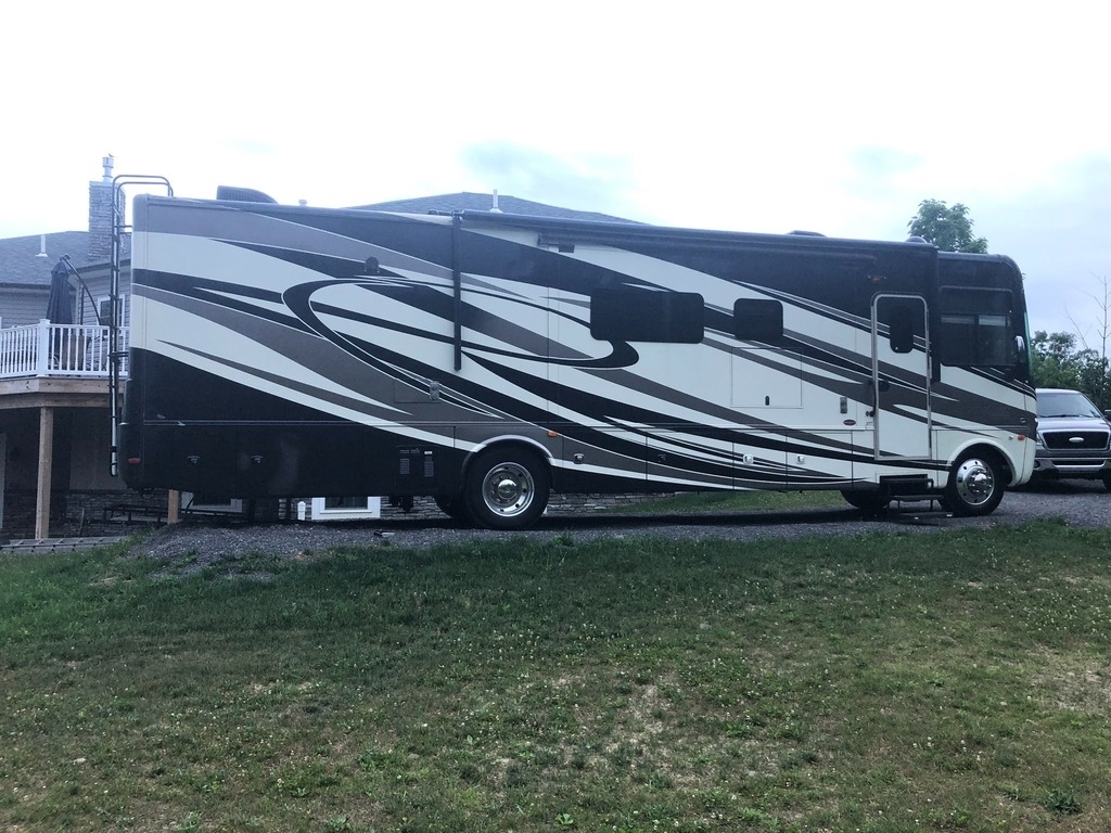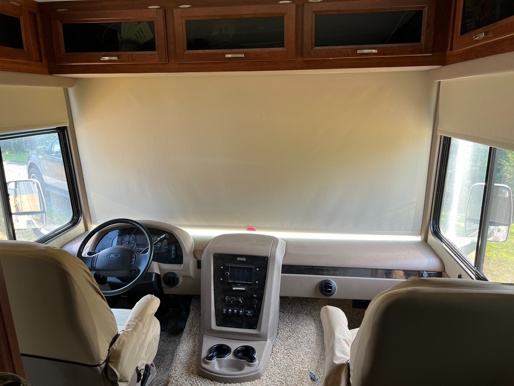This 2014 Forest River is 37.92 feet long and comes equipped with 3 slide outs, 4 awnings, 2 air conditioning units, and can sleep four people comfortably. This RV is powered by a Triton V10 engine and sits on a Ford chassis.