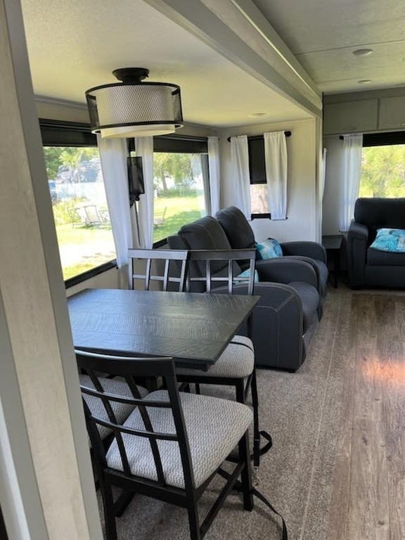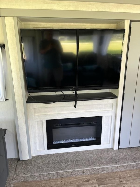 slide-outs, 2 power awnings, 1 A/C unit, a fireplace, and room to sleep up to 6.