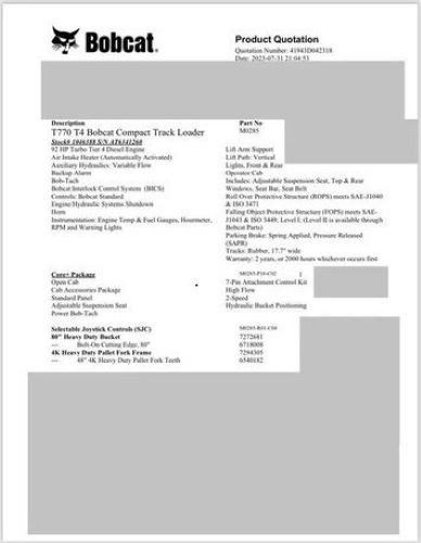 T770. Available attachments include: Demo Dozer attachment, forks, and 80-inch