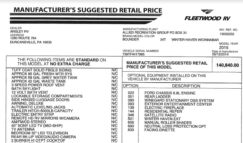 2015 Fleetwood Bounder 34T Class A RV For Sale in Centre Hall, PA 16828