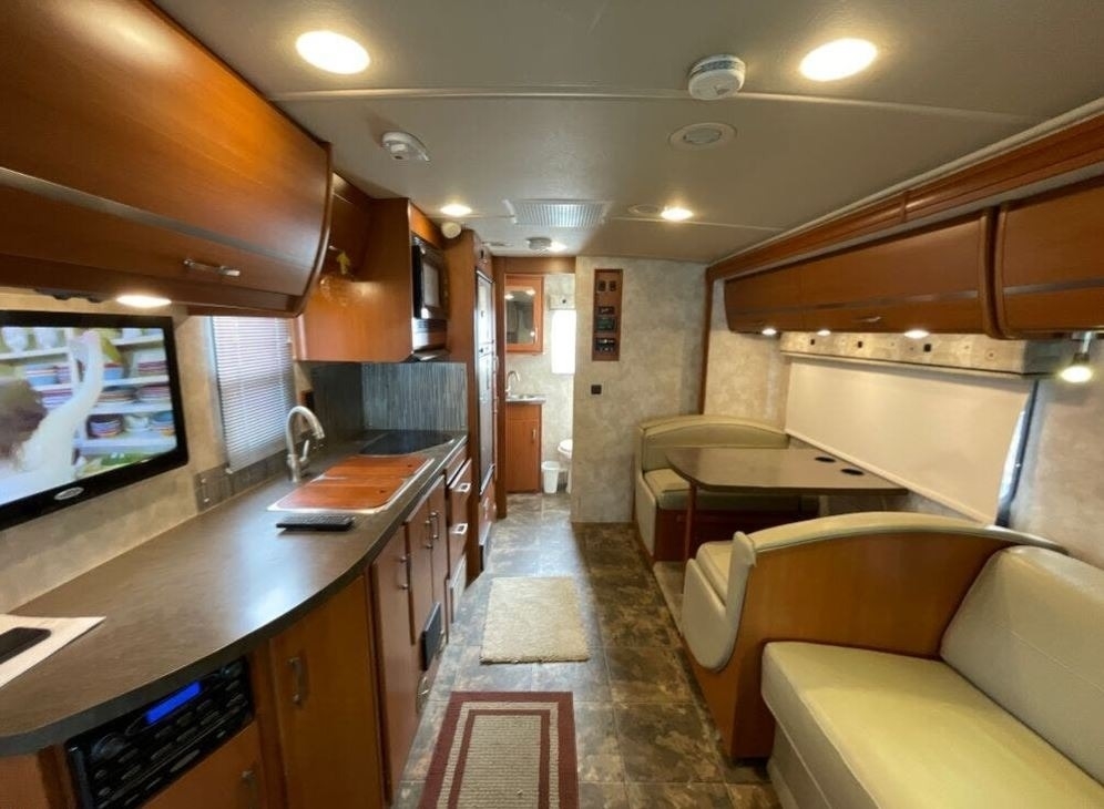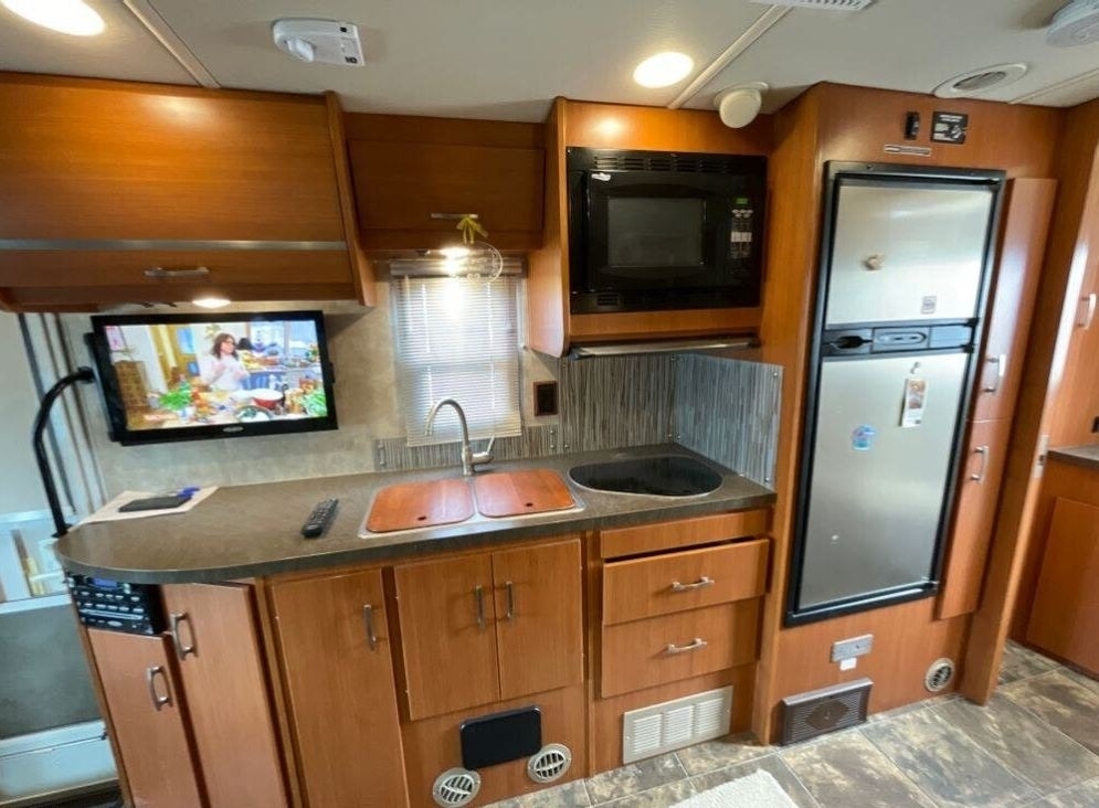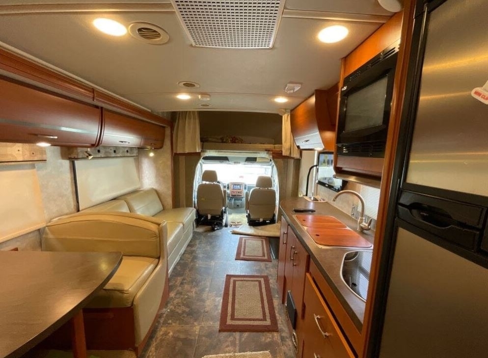 This 2013 Winnebago View 24M Class C Motorhome is 24.5 feet long and comes equipped with a double wide slide out, a power patio awning, an air conditioning unit, and can sleep six people comfortably. This RV is powered by a 3.0L 6-Cylinder 188 HP Mercedes-Benz turbo diesel engine paired with an automatic transmission. The compact length of this RV allows it to be used in almost all National Parks.