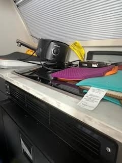 cassette toilet), and a galley kitchen with a two-burner stove, stainless sink,