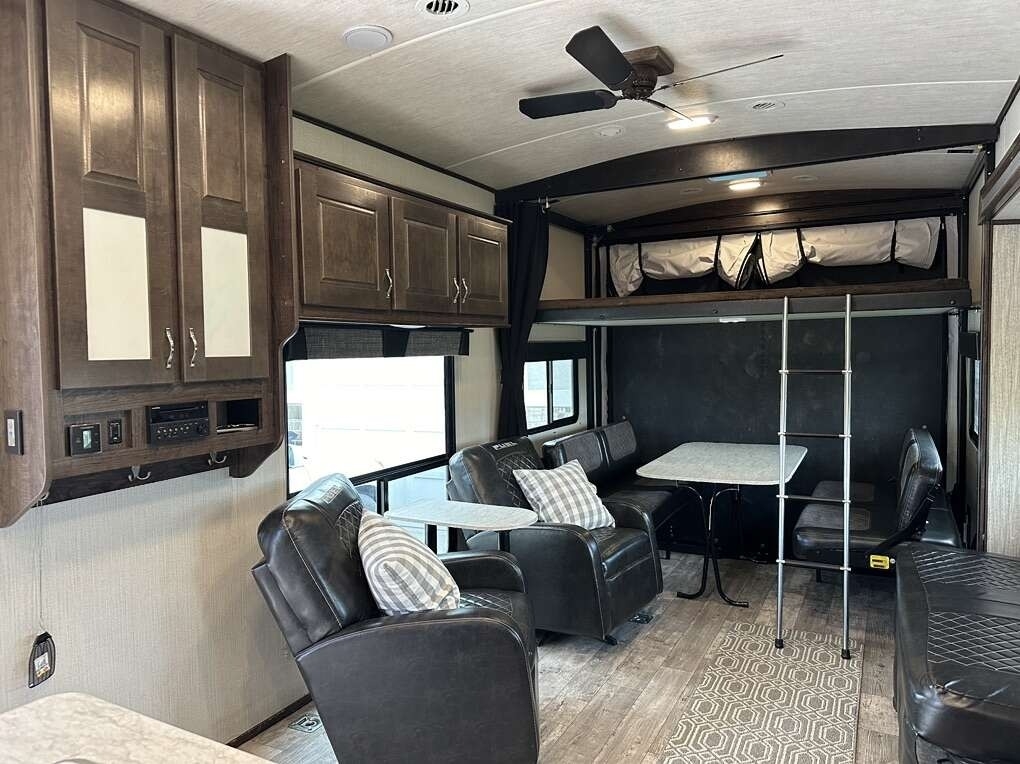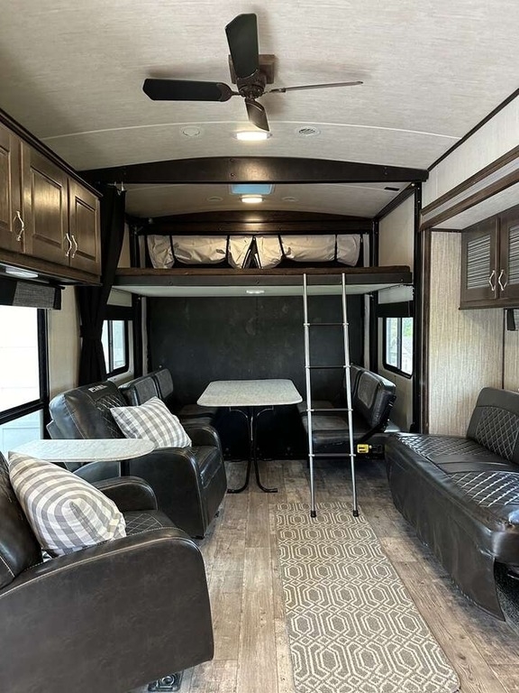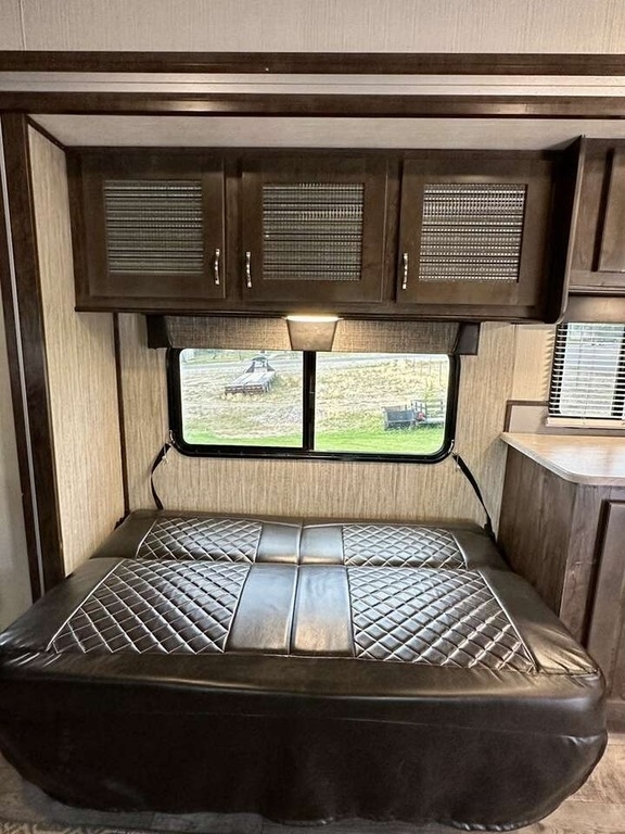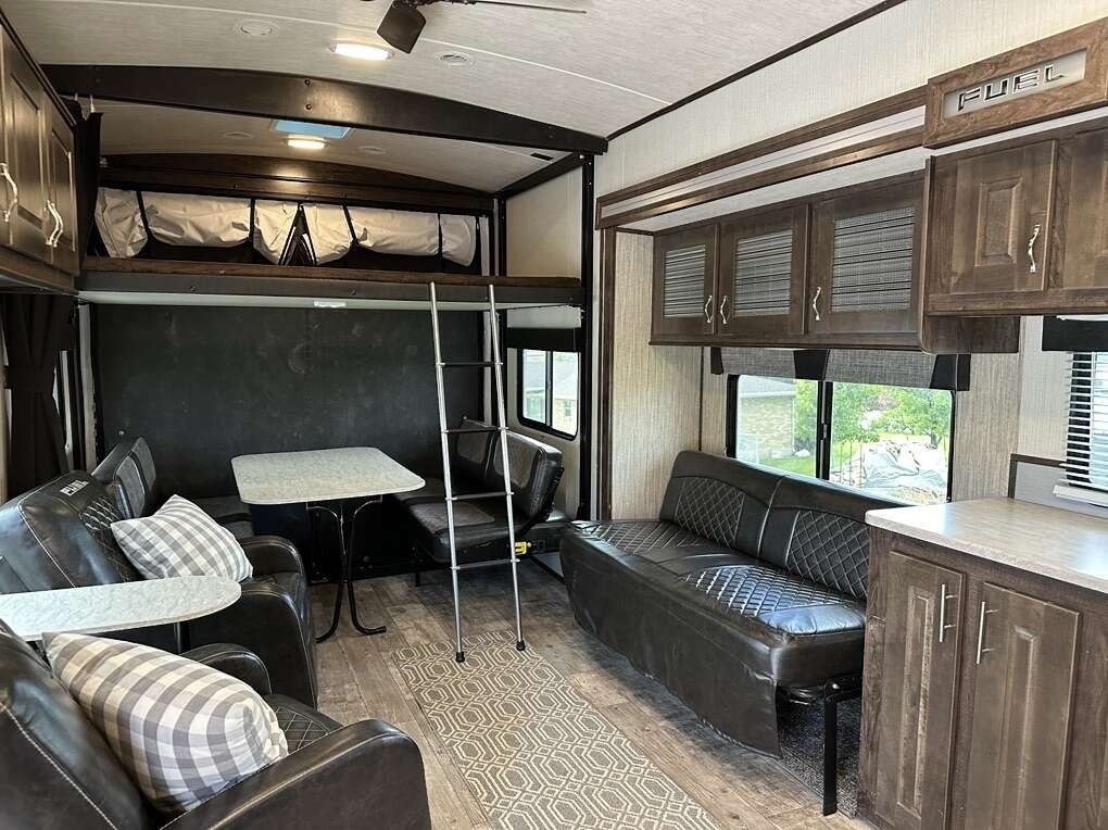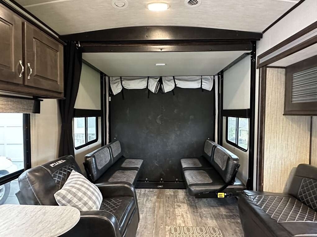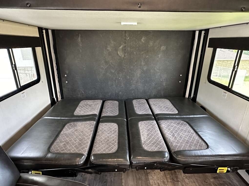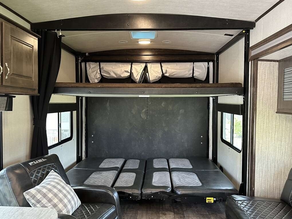 “This toy hauler is in great shape and everything works. Most 4-seat side by sides can fit in the back. On-board generator that runs off the on-board fuel tank which also has a pump to fill your toys. The mattress in the master bedroom has been upgraded to a residential mattress for a good night’s rest. Happy Jack Queen bunk bed system in the rear and a sofa that folds to a bed as well. 98-gallon water tank, 63-gallon black and grey tanks, and 200-watt solar make it great for boondocking!”