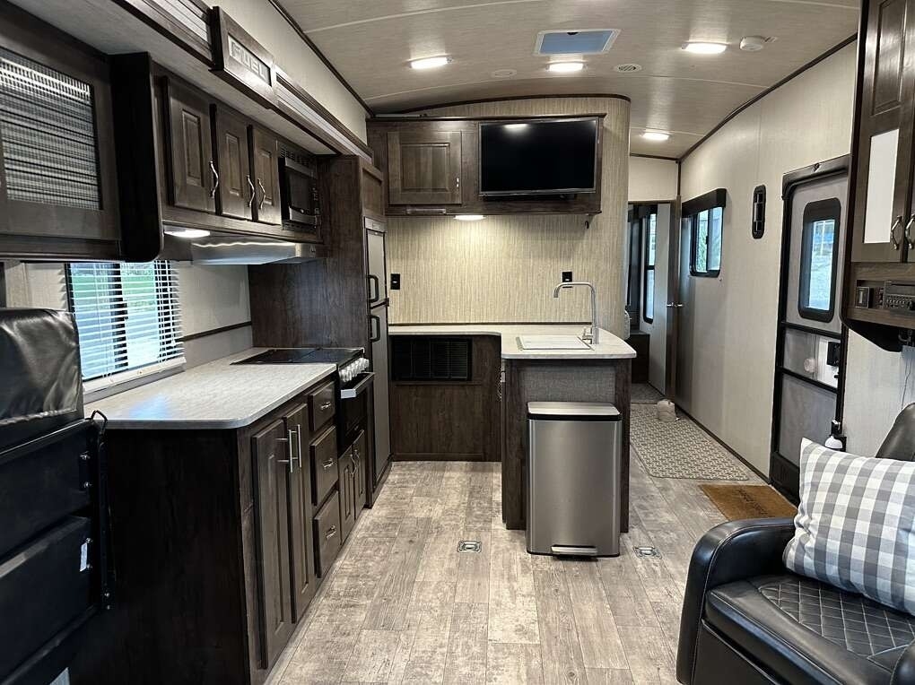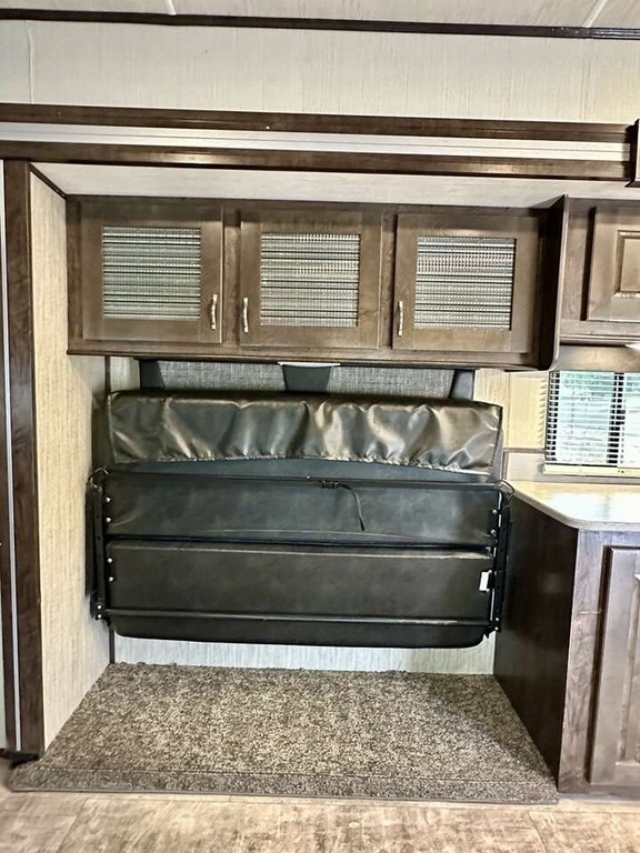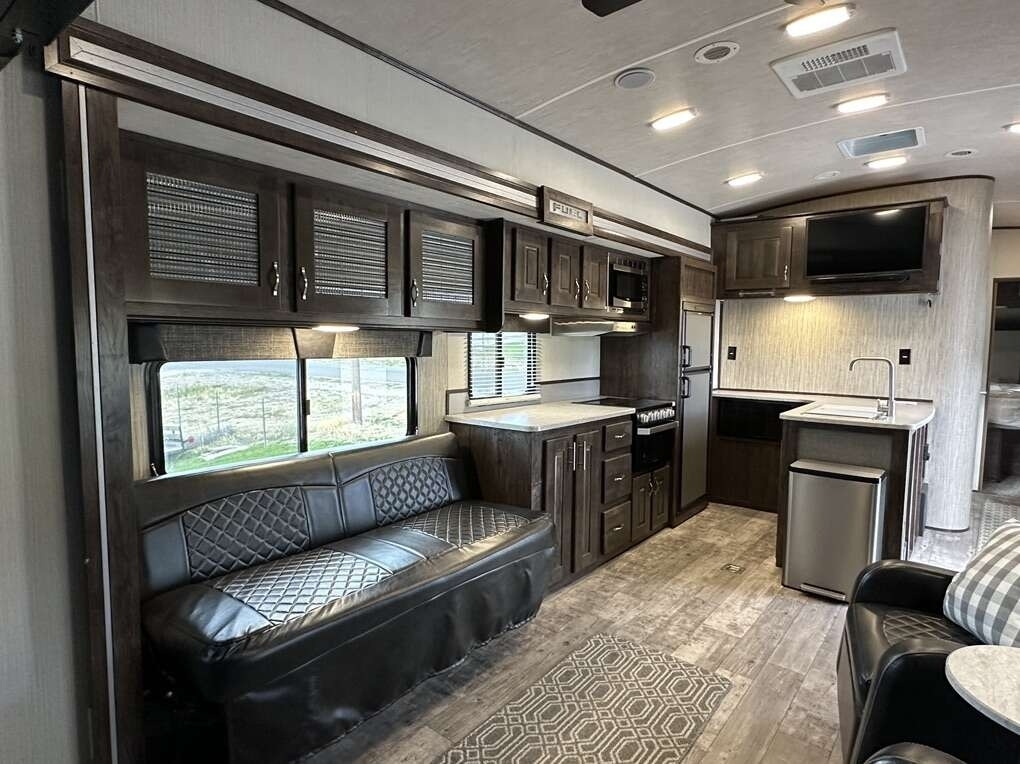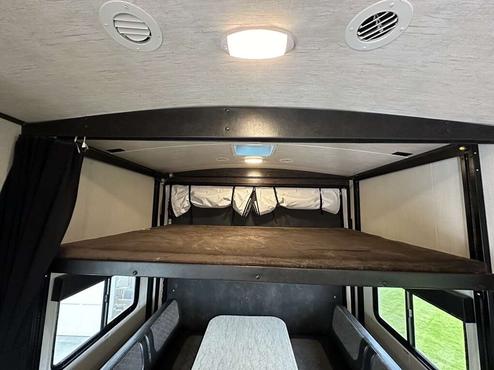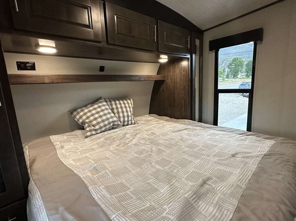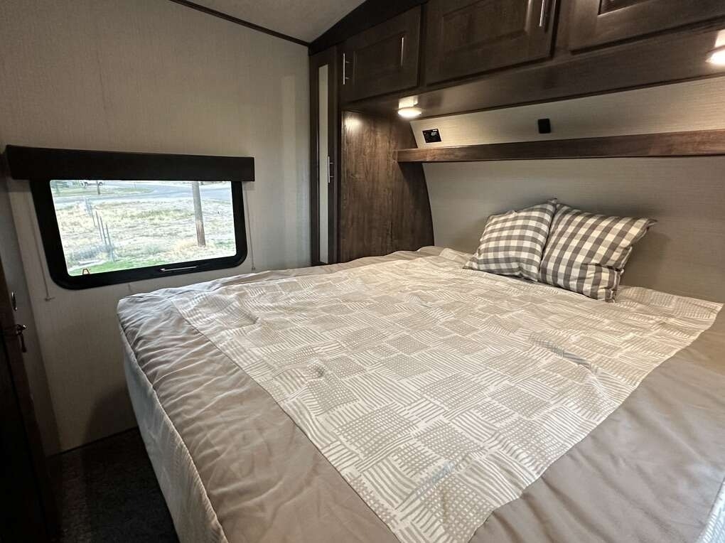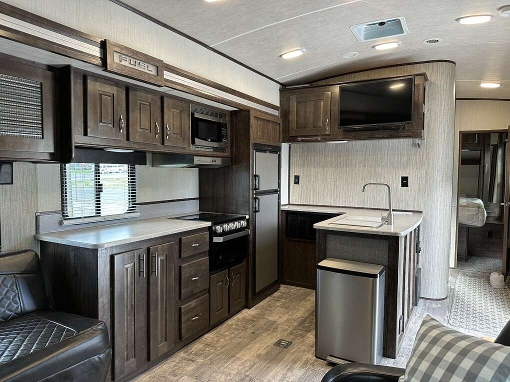 “This toy hauler is in great shape and everything works. Most 4-seat side by sides can fit in the back. On-board generator that runs off the on-board fuel tank which also has a pump to fill your toys. The mattress in the master bedroom has been upgraded to a residential mattress for a good night’s rest. Happy Jack Queen bunk bed system in the rear and a sofa that folds to a bed as well. 98-gallon water tank, 63-gallon black and grey tanks, and 200-watt solar make it great for boondocking!”