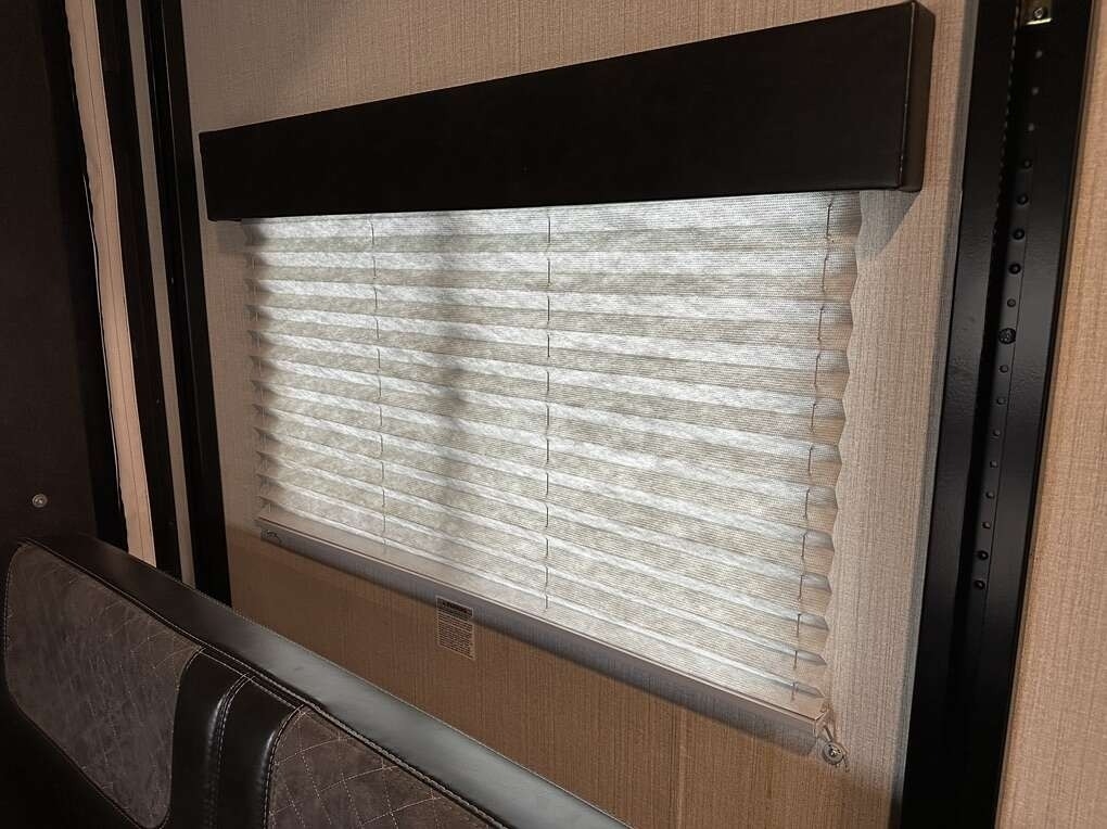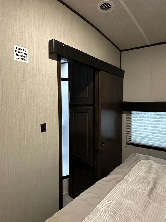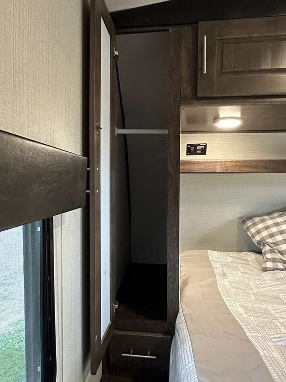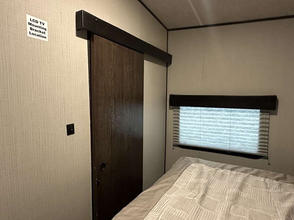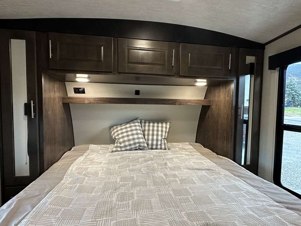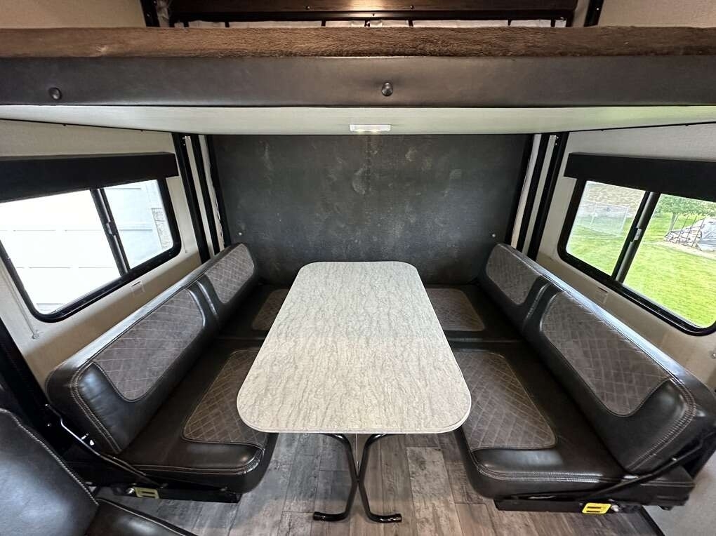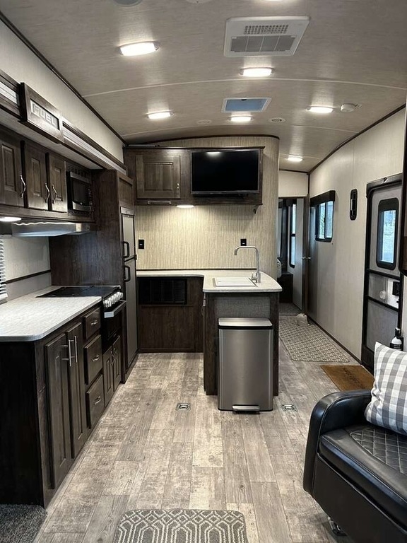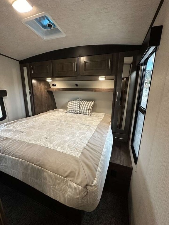 “This toy hauler is in great shape and everything works. Most 4-seat side by sides can fit in the back. On-board generator that runs off the on-board fuel tank which also has a pump to fill your toys. The mattress in the master bedroom has been upgraded to a residential mattress for a good night’s rest. Happy Jack Queen bunk bed system in the rear and a sofa that folds to a bed as well. 98-gallon water tank, 63-gallon black and grey tanks, and 200-watt solar make it great for boondocking!”