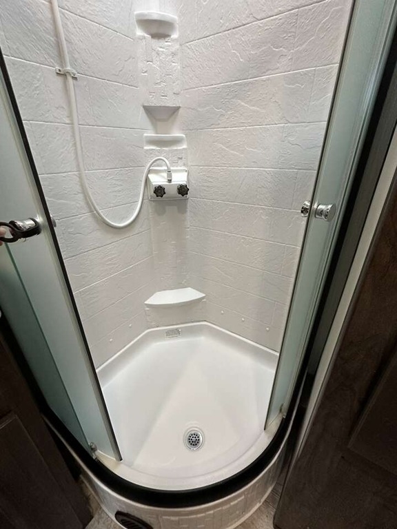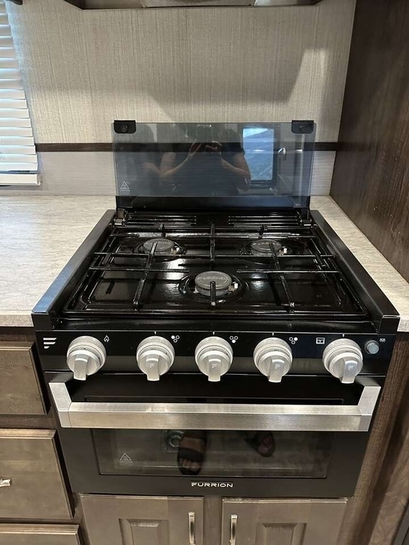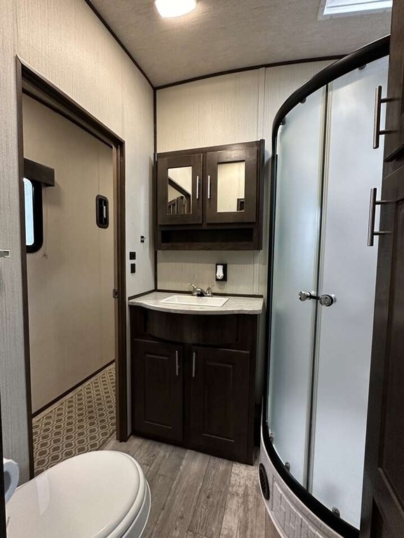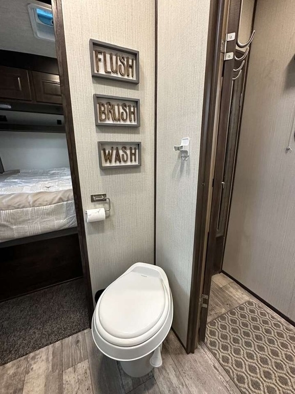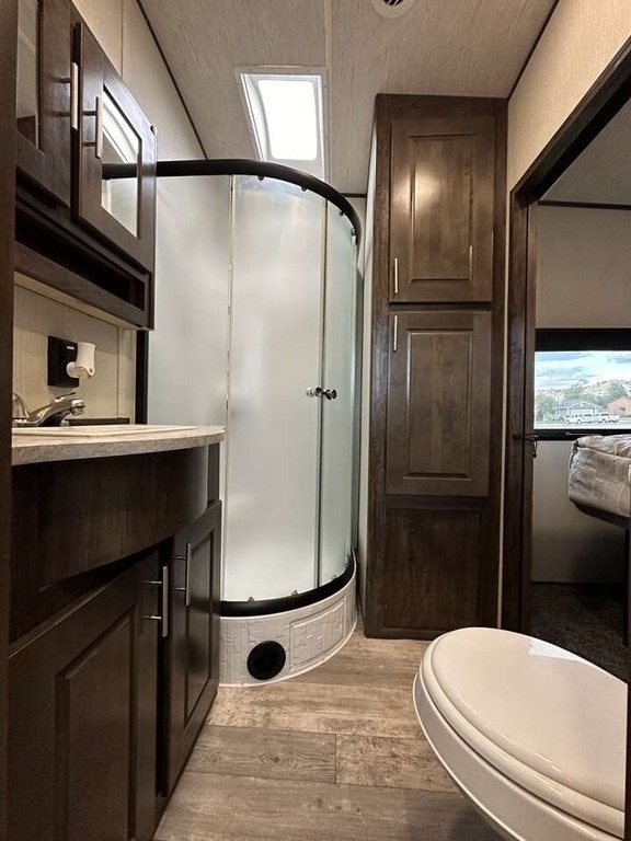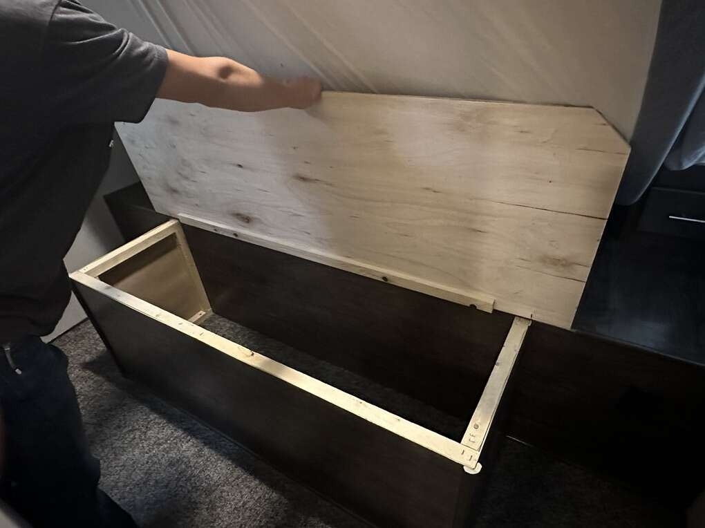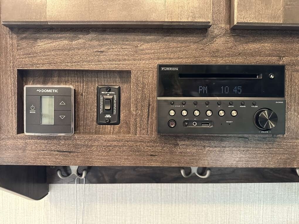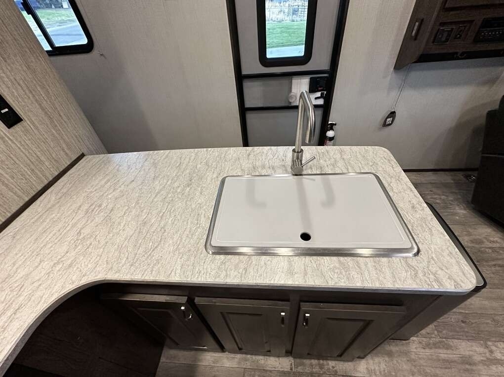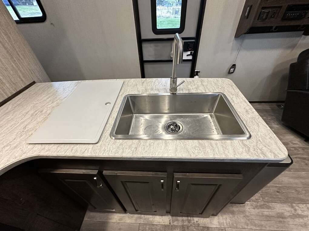 “This toy hauler is in great shape and everything works. Most 4-seat side by sides can fit in the back. On-board generator that runs off the on-board fuel tank which also has a pump to fill your toys. The mattress in the master bedroom has been upgraded to a residential mattress for a good night’s rest. Happy Jack Queen bunk bed system in the rear and a sofa that folds to a bed as well. 98-gallon water tank, 63-gallon black and grey tanks, and 200-watt solar make it great for boondocking!”