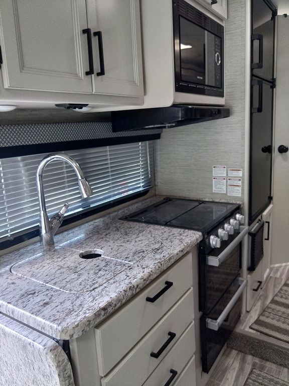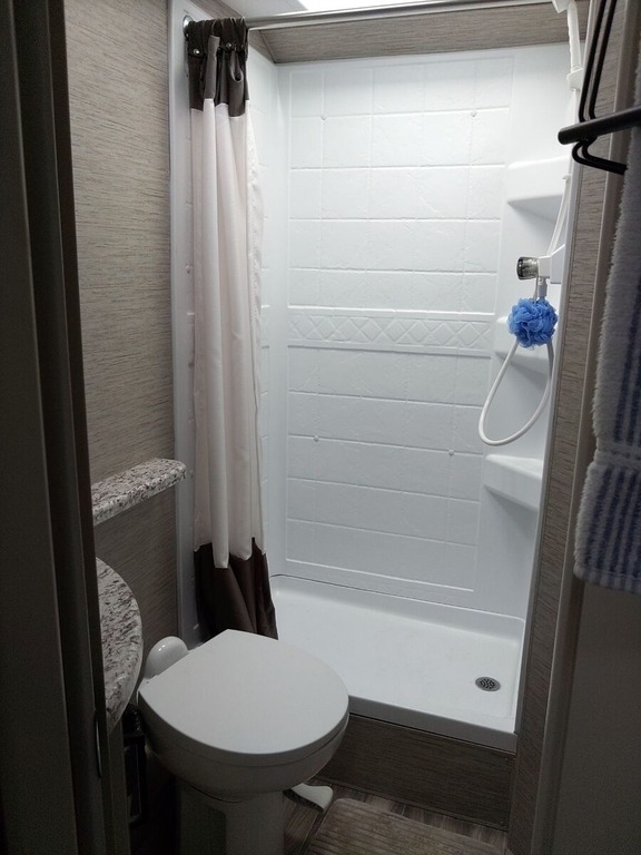 Inside, you’ll find a bright, modern living space with new curtains and blinds, vinyl flooring, and comfortable seating. The kitchen is fully equipped with a 3-burner stove, oven, microwave, mid-size refrigerator, sink covers/cutting boards, and a bench dinette. The rear bedroom features a queen bed with privacy curtain, full-size closet, and overhead storage. The bathroom includes a shower, porcelain toilet, medicine cabinet, and vent fan.