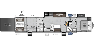 This Forest River has an overall length of 45.25 feet and comes equipped with 2 power retractable slide-outs, 2 power retractable awnings, 2 A/C units, solar, a 15-foot garage, 1½ baths, a fireplace, an outdoor kitchen, and plenty of room to sleep 7. This unit has been well-maintained.