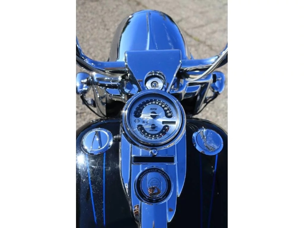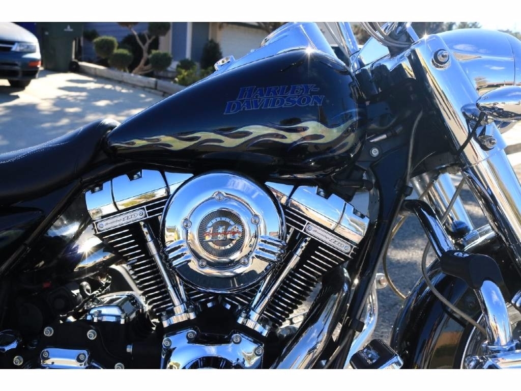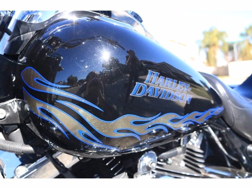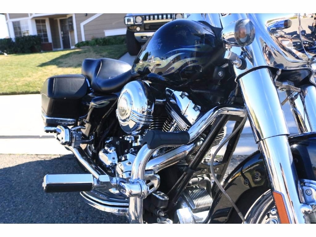 This 2007 Harley Davidson Road King Special Edition CVO has a Screamin' Eagle 110 engine in it. The motorcycle has 37,792 original miles on it. It has a brand-new motor, with papers, that has only 350 miles on it. It has a black with blue and silver flames custom paint job.