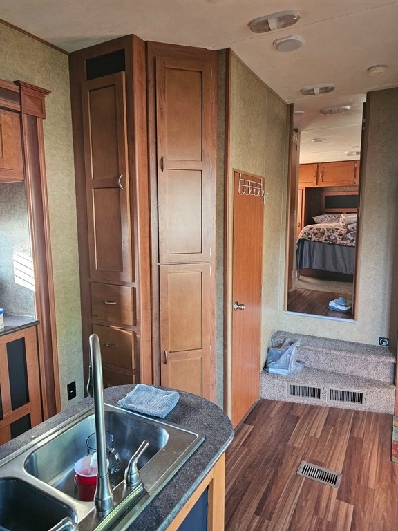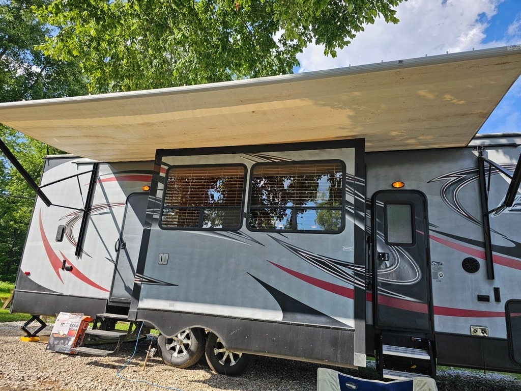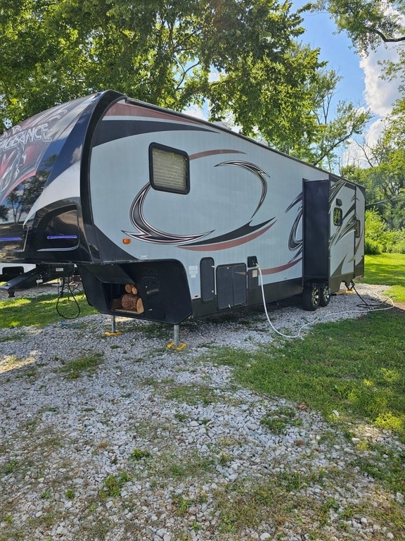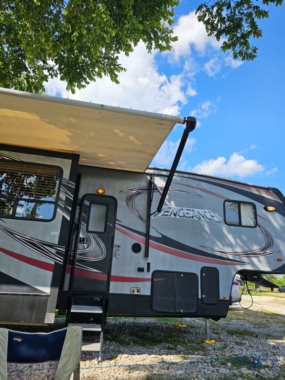 “This 2013 Forest River Vengeance Fifth Wheel Toy Hauler is ready for your next adventure. It features a well-equipped kitchen with a 3-burner stove and a microwave/convection oven combo. Enjoy climate control with ducted heating and air conditioning, and a convenient 1.5 bath setup. The RV comes with one TV and has space for up to three additional TVs, including an outside entertainment area with room for another TV. Recent updates include new tires installed last September, a new hot water heater element, and a new spare jack. Additional features include pass-through storage, a dedicated compartment for a gas tank, and the flexibility of a gas or electric water heater. This toy hauler offers both comfort and practicality, making it an excellent choice for those seeking a versatile and well-maintained RV.”