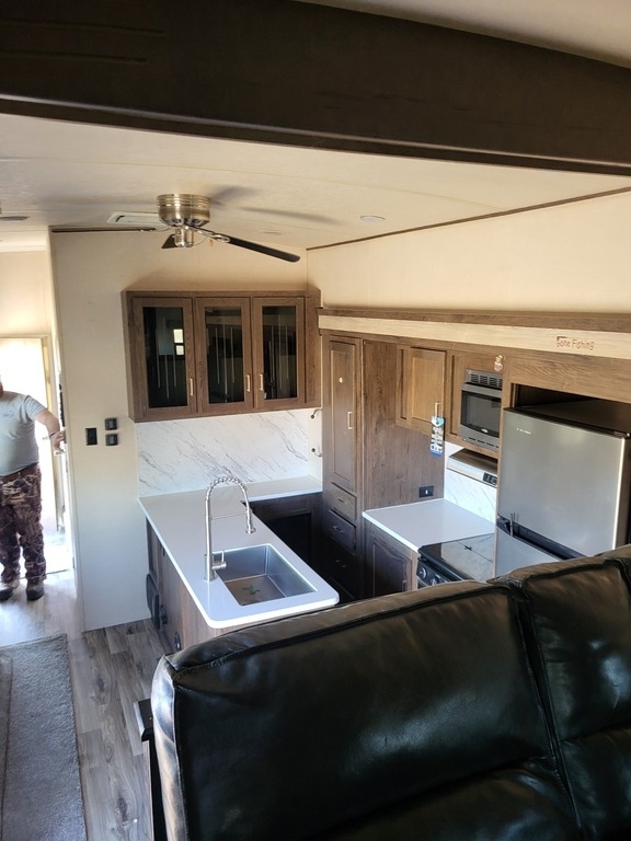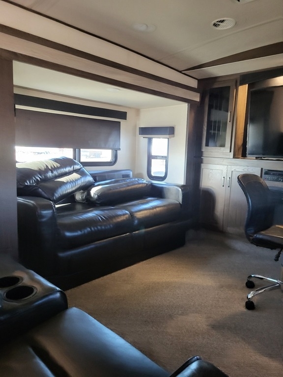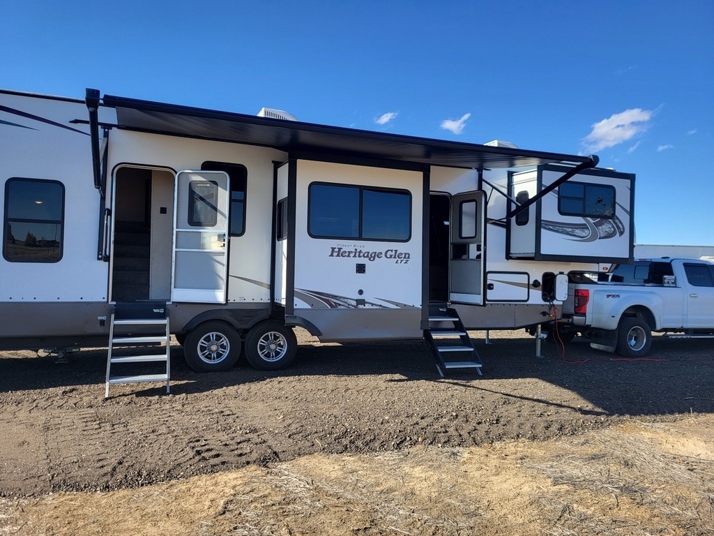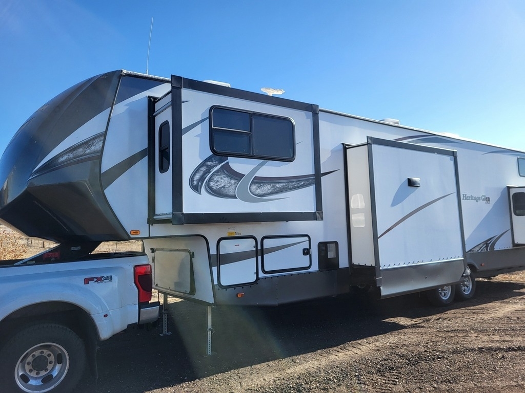 “This 2019 Forest River Wildwood Heritage Glen LTZ 378FL Fifth Wheel is super clean, well-maintained, and packed with updates—ready for full-time living or extended travel. It features 5 spacious slide-outs, an upfront living area, a cozy loft, and a custom touch with one couch replaced by a desk—perfect for working on the road. Recent upgrades include a new residential refrigerator, new fireplace, new toilet, new 12-gallon hot water tank, new awning, and new tires (all done about a year ago). It also comes with EZ Snap skirting, 2 new batteries, and a roomy layout with plenty of storage. This unit has been well cared for and is turn-key ready for its next adventure.”