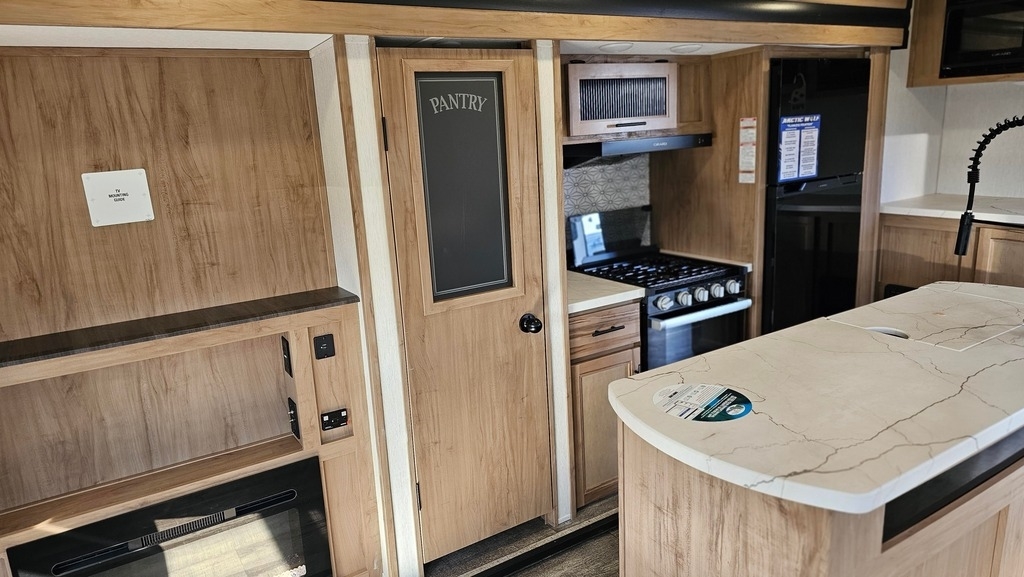 Center Kitchen With Full-Size 12 volt Electric Refrigerator, Microwave, And 3-Burner Stove With Oven