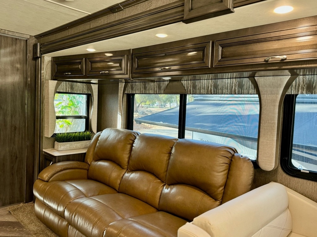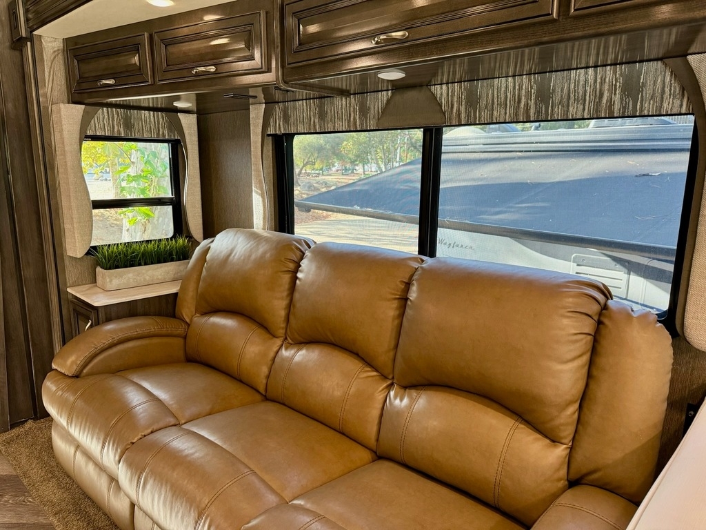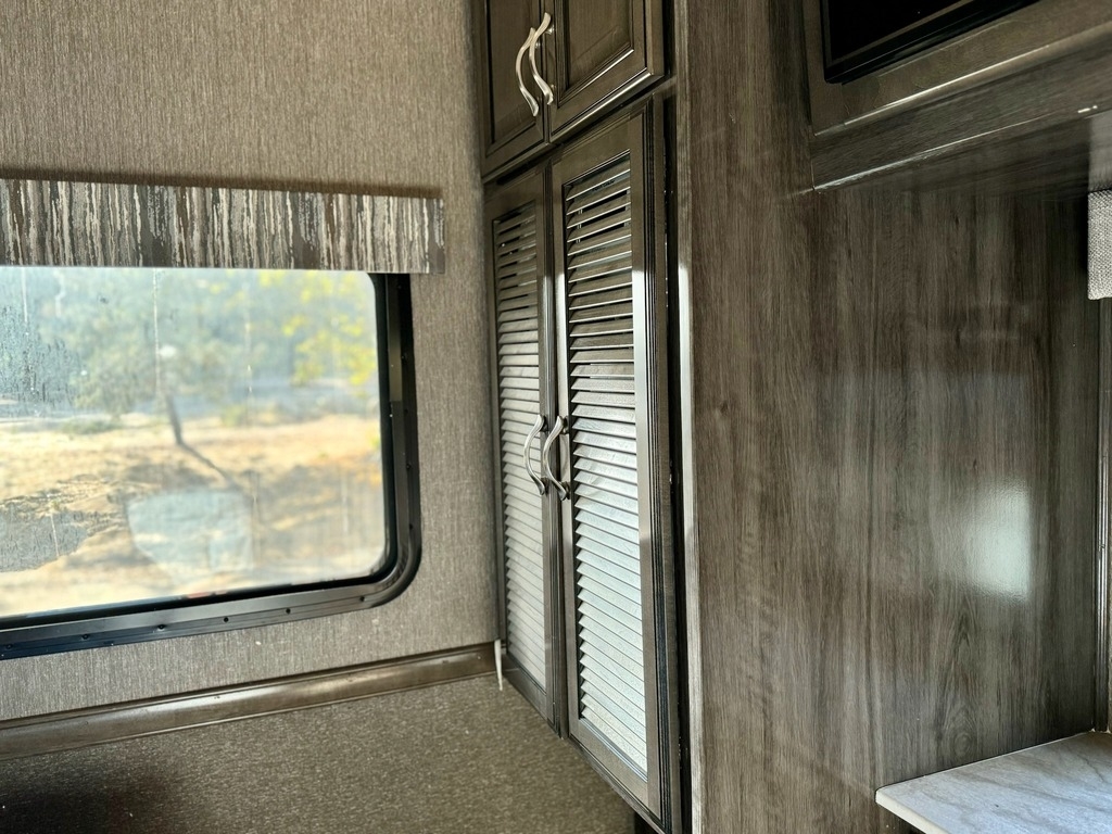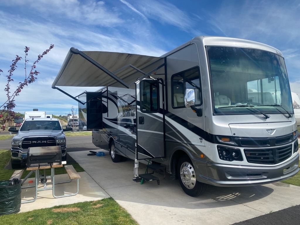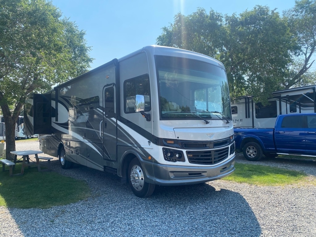 This Fleetwood is powered by a 7.3L V8 engine and a 6-speed automatic transmission with 23,190 miles. The overall length is 34.25 feet and it comes equipped with 2 power retractable slide-outs, 1 power retractable awning, 2 A/C units, a fireplace, an exterior entertainment system, and plenty of room to sleep 8. This unit has been well-maintained.