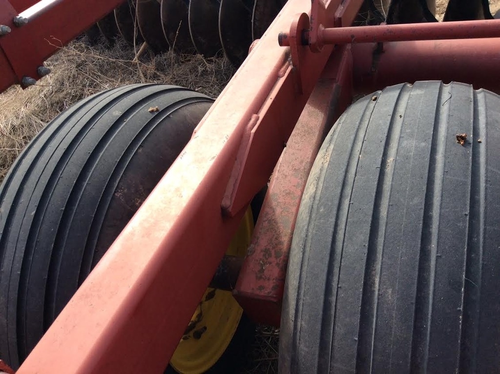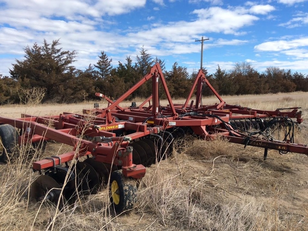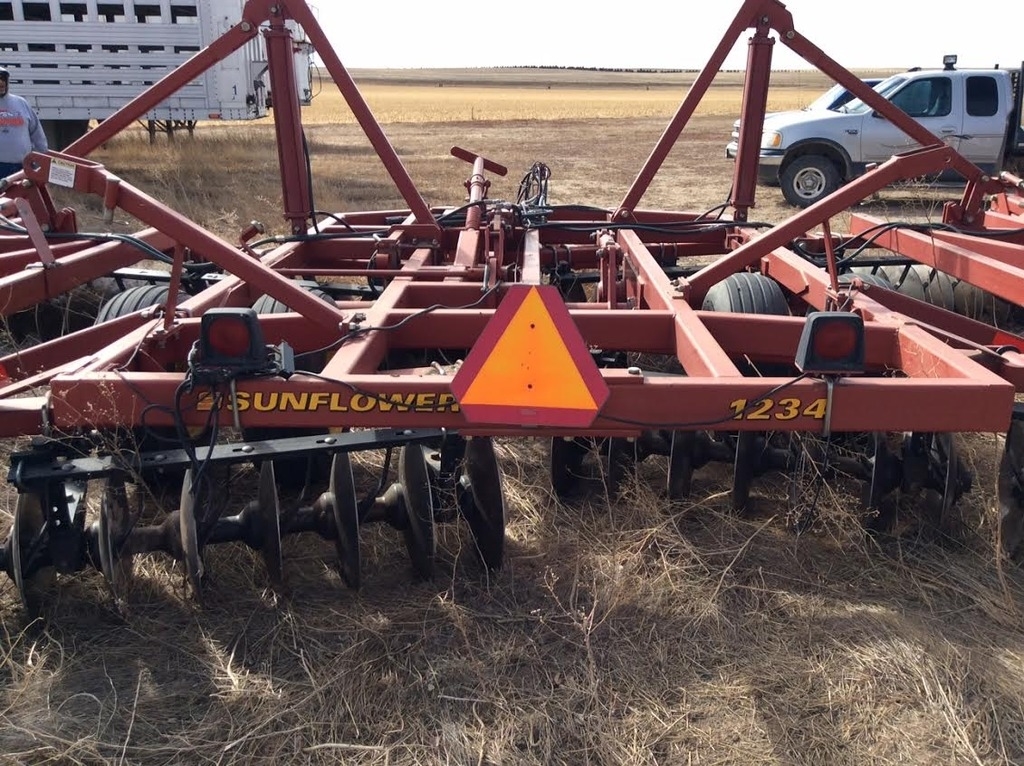 The Model 1234 Disc Harrow is a medium weight disc that capably handles primary through finish discing operations. An all welded frame features even weight distribution for uniform penetration, and the three flexible sections assure that rough, rolling and terraced ground will be tilled evenly and smoothly. Large tires provide excellent flotation, unmatched depth control and the base for level discing. Like all Sunflower discs, the 1234 is loaded with features that give it a definite edge over competitive brands. These features will save you time and enable the 1234 to always provide a level job of discing, regardless of terrain, discing depth, and/or soil condition.