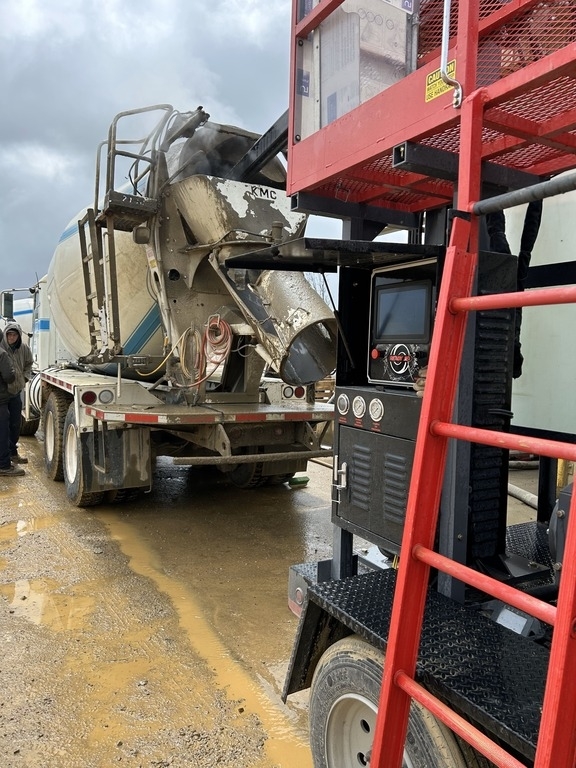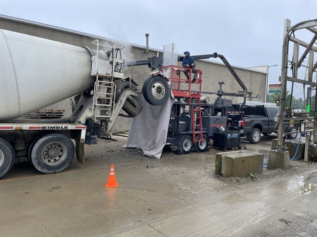 Advantages: If safety is the priority, no live person has to go into the barrel. No chipper damage to the inside or outside of the barrel from air chisels. Only one unit down at a time and unit can go right back into operation. Approximately 1 hour to clean and discharge one yard of material.