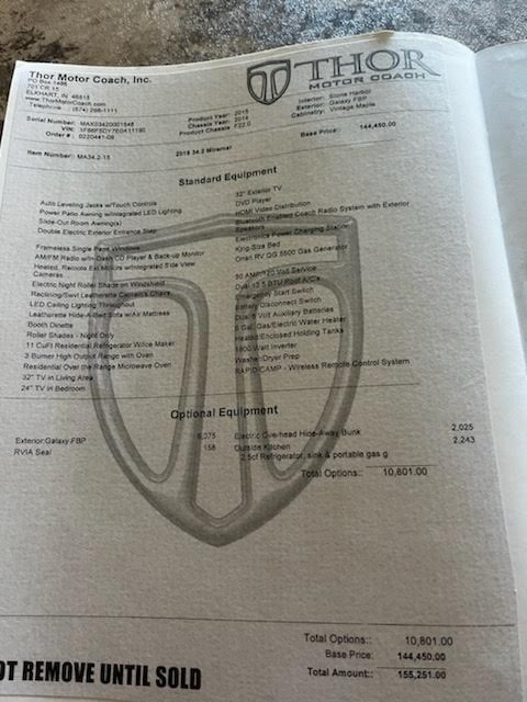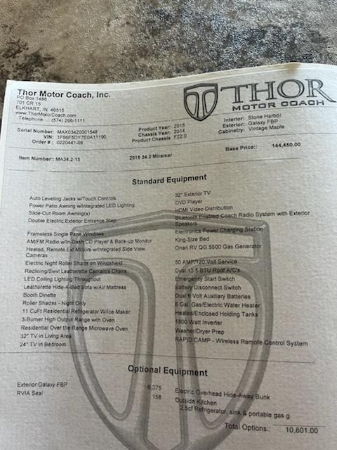 “2015 Thor Motor Coach Miramar 34.2 Class A RV – in excellent condition inside and out. This well-maintained coach offers a spacious floorplan with all the comforts of home, including a full bath, king bed, residential-style kitchen, and ample storage throughout. Everything is in great working order and ready for the road. The navigation system currently works, but may need to be repaired or replaced for optimal performance. A clean, comfortable, and reliable motorhome that’s perfect for both weekend getaways and extended trips. Turn-key and ready for your next adventure!”