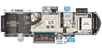 perfect for year-round use. The garage area includes a Happi-Jac system that