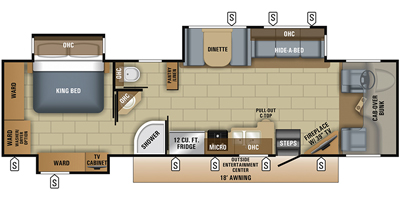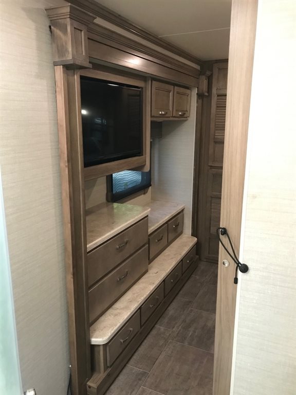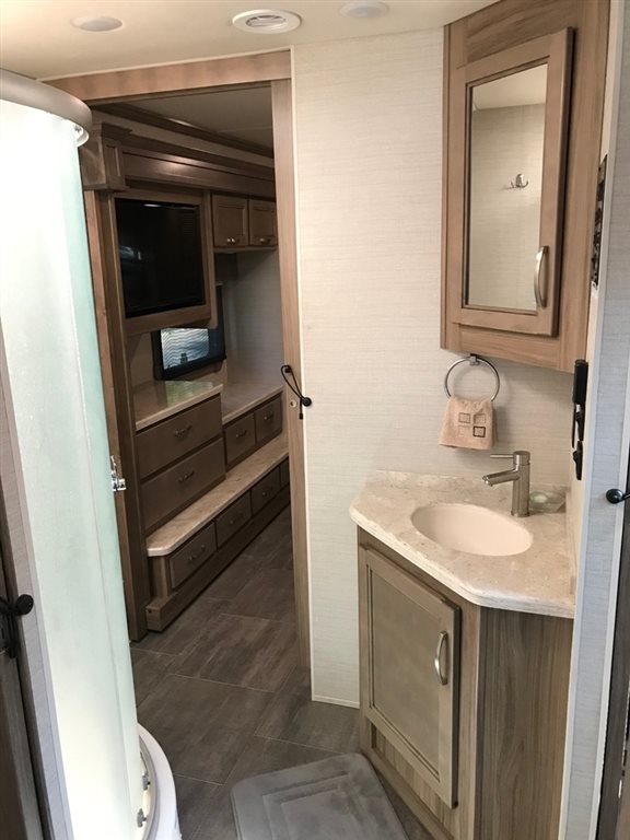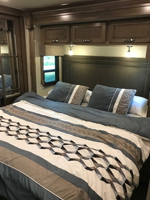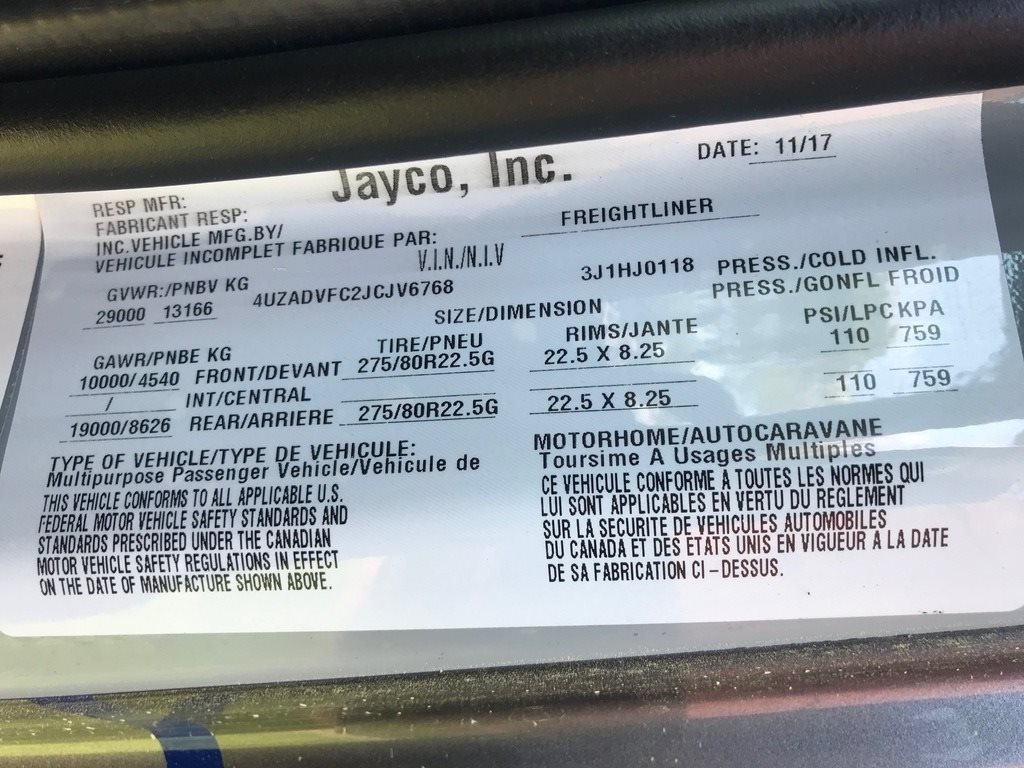 This 2018 Jayco is powered by a 6.7L Turbocharged Cummins Diesel Engine combined with a 6-speed Allison Automatic Transmission on a Freightliner Chassis, with 6,725 Miles. The overall length is 38 feet and comes equipped with an 8KW Onan Diesel Generator (125.3 Total Hours), 3 Slide Outs, 1 Awning, 2 A/C units, and plenty of room to sleep 8.