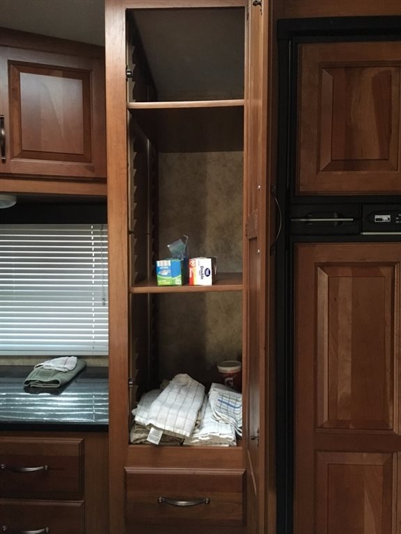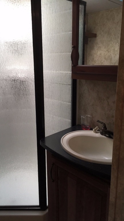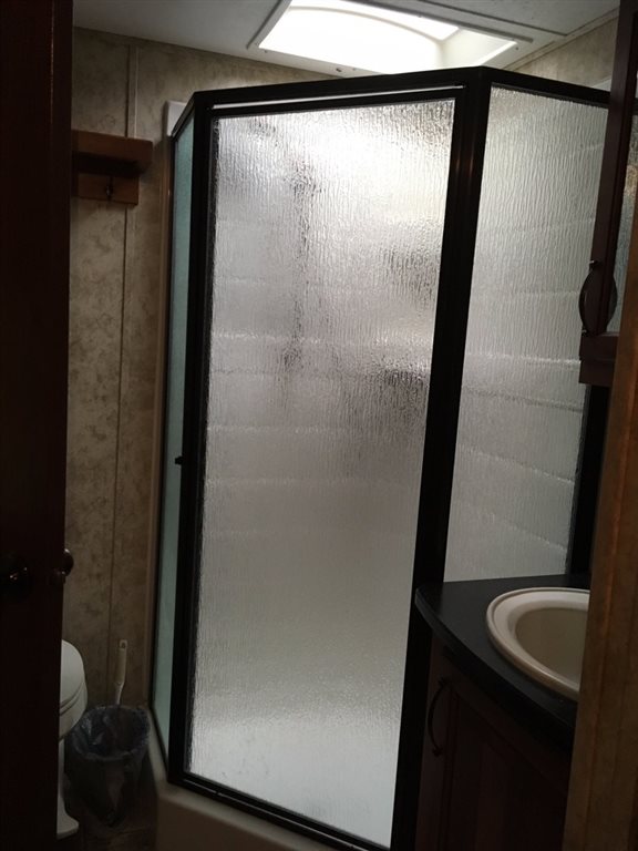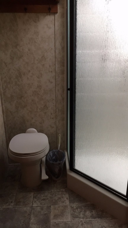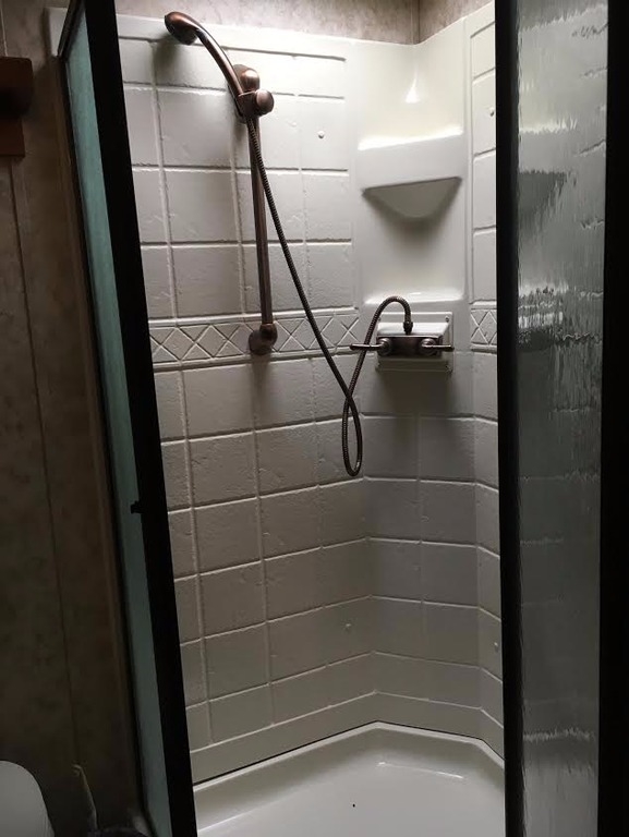 The bathroom is spacious and has a corner shower. The kitchen is open with plenty of overhead storage and a pantry.