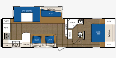 equipped with 1 power-retractable slide-out, a 16-foot power awning, 1 A/C unit,