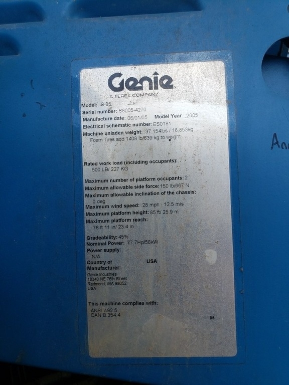 This 2005 Genie S-85 Boom Lift is offered for sale and ready to work.