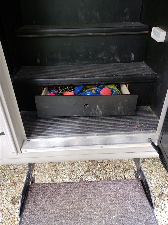 BBQ tools, campfire starters, cookware, single brew coffee maker, dinnerware, silverware, grill tri-pod for over campfire, black and gray tank cleaners, deodorants, toiletries, auto fill kit for house batteries, awning clips, lights, tablecloths and clips, etc.