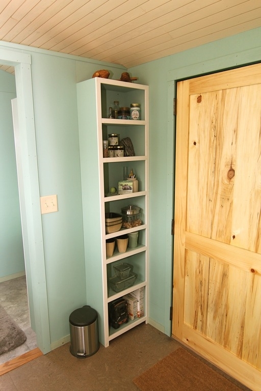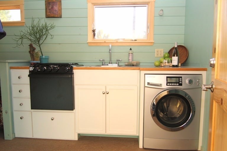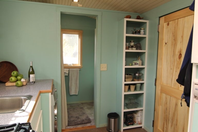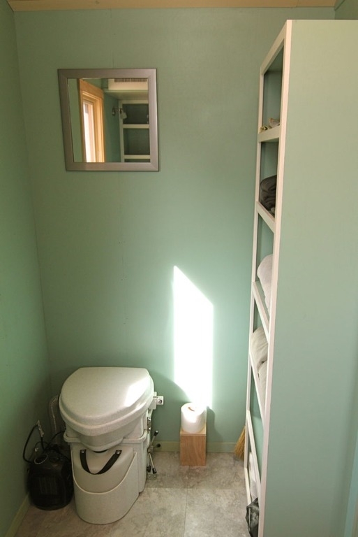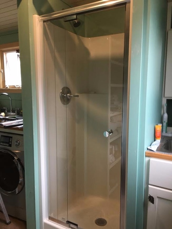 The kitchen has hot/cold water, SS sink, lightweight & compact RV component electric/propane refrigerator/freezer, gas stove/oven, combo washer/dryer along with pantry, spice and ample drawer and cabinet space. The 3/4 bath has no-smell Nature’s Head composting toilet, tall shower stall with a glass door, hot/cold water, SS sink, medicine cab/mirror combo, cabinets & linen shelves.