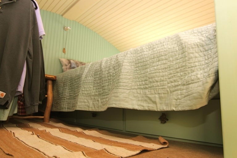 Living/dining area accommodates a full-size pull-out sofa/futon and fold-down 2-top table with windows that offer light and privacy. The elevated sleeping area has a full size platform bed with a 8'' memory foam mattress that you can sit up in, a 3-drawer storage in the platform, a hanging clothes rod and twin windows for light & privacy.